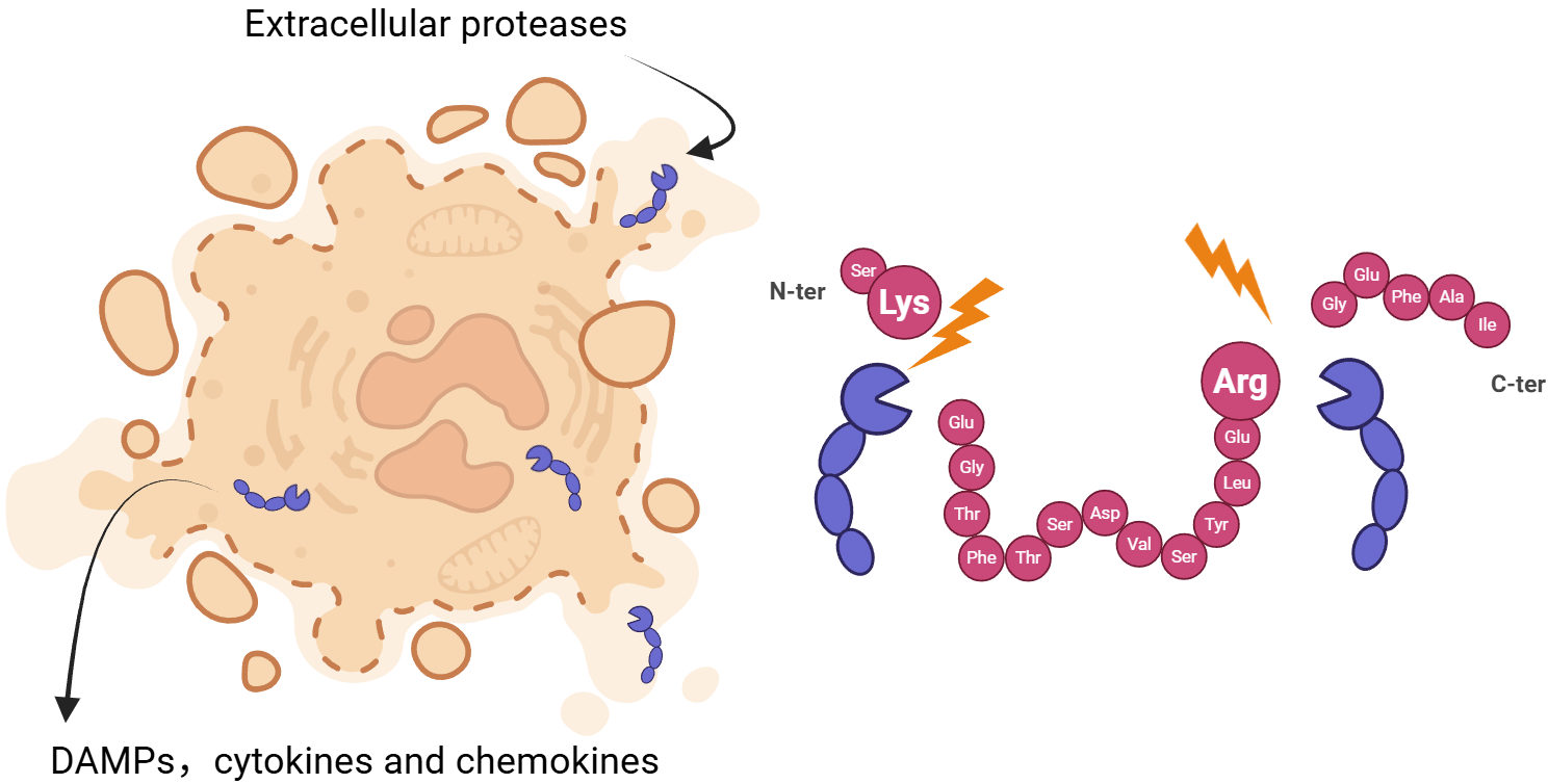 坏死细胞膜破裂触发胞外蛋白酶介导的特异性蛋白切割
