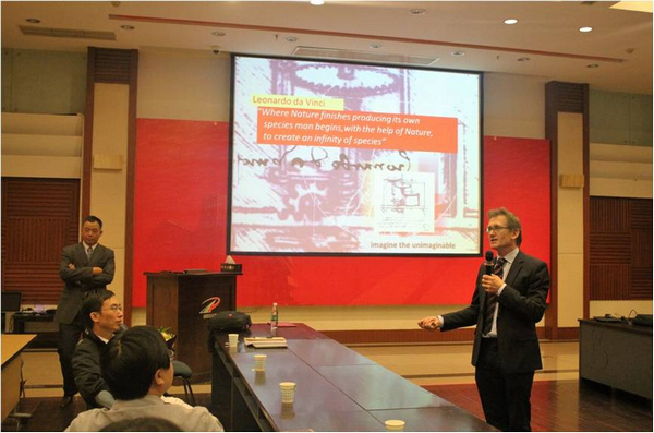 在授聘仪式上,上海应物所副所长马余刚为费林加教授颁发了由所长赵振堂签发的上海应物所名誉研究员聘书,并对费林加教授新近获得的诺贝尔奖表示热烈祝贺。随后,费林加教授致答谢词,并做了题为《从分子到动态分子系统》(From Molecules to Dynamic Molecular Systems)的学术报告。报告中,他以飞鸟与飞机的比喻形象阐明了自然与科技的关系:科技难以完全复制自然界的神奇,但是我们可以受到自然的启发,利用自然赋予我们的工具来设计和创造强大的人工机器。在随后一个多小时的报告中,费林加教授展示了近年来其研究团队在这一领域取得的丰硕成果。他们实现了可在光能或化学分子“燃料”驱动下定向旋转的分子马达,以及由这些分子马达构成的“纳米车”。这些精巧的分子机器甚至能驱动质量一万倍于自身的玻璃小杯旋转,可谓巧夺天工,令人惊叹不已。此外,费林加教授还展示了这些分子机器在抗生素药物受控释放等生物治疗应用中的广阔前景。利用这种抗生素药物对光线的响应,他构建了一幅由受控的菌斑形成的代表中华文化的太极图案,令人印象深刻。他表示,他最大的梦想之一,就是能够利用这些光控分子开关来控制肿瘤药物的活化与释放,在减轻药物毒副作用的同时增强其对癌细胞的靶向杀伤能力。最后,费林加教授引用达芬奇的名言结束了报告——“从自然创造人类这一物种开始,人类就在自然的帮助下开启了无限新物种的创造”,表达了他对自然与科技关系的睿智见解和对科学创造的满满信心。