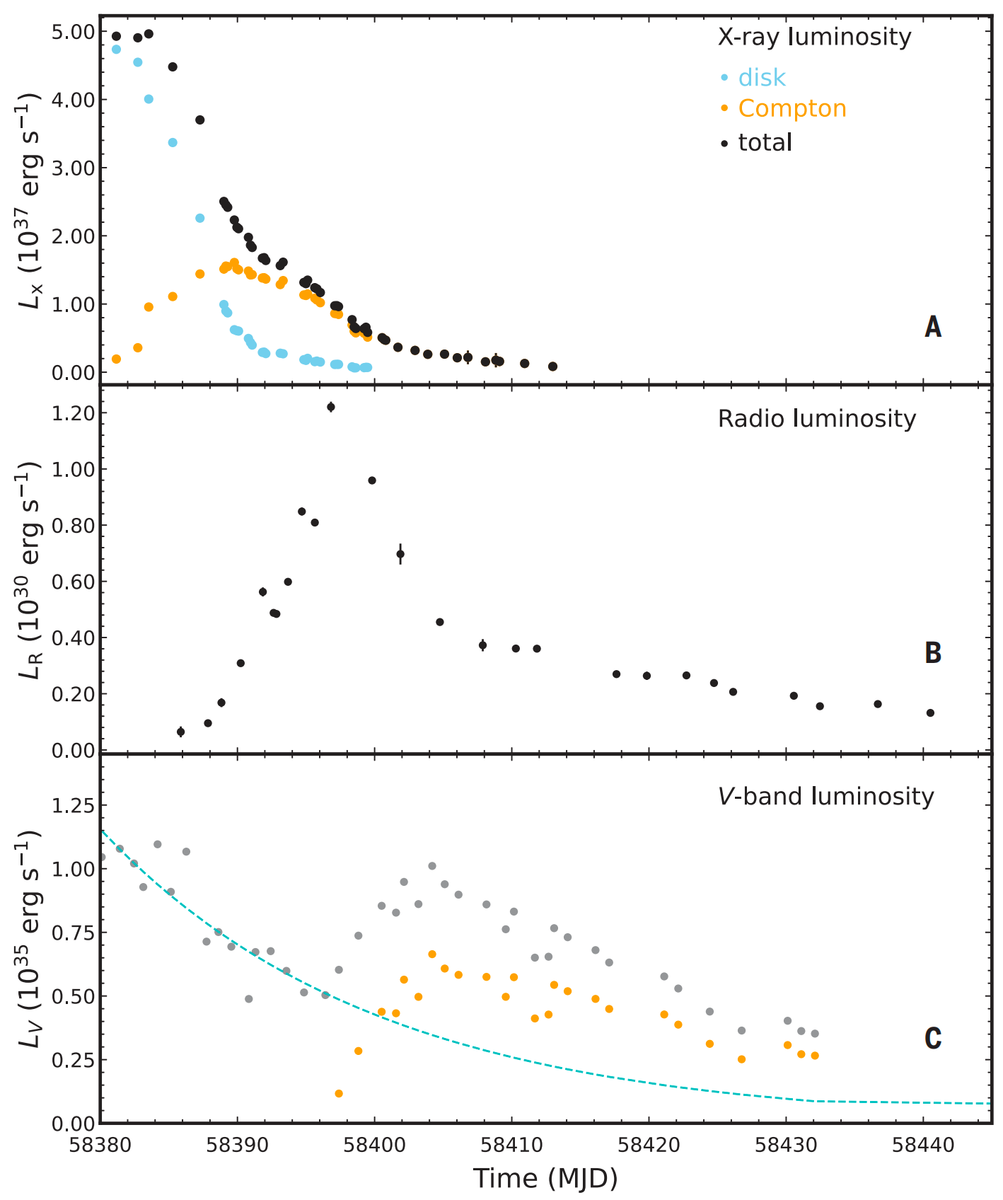 图2.?黑洞X射线双星MAXI?J1820+070的多波段光变。A(上图)是X射线辐射随时间的变化,其中橙色圆点是热吸积流的硬X射线;B(中图)是喷流的射电辐射随时间的变化,可见其峰值滞后硬X射线约8天;C(下图)是吸积盘外区的光学辐射随时间变化,其中橙色圆点是扣除整体下降趋势后呈现的光学辐射的峰,滞后于硬X射线约17天。