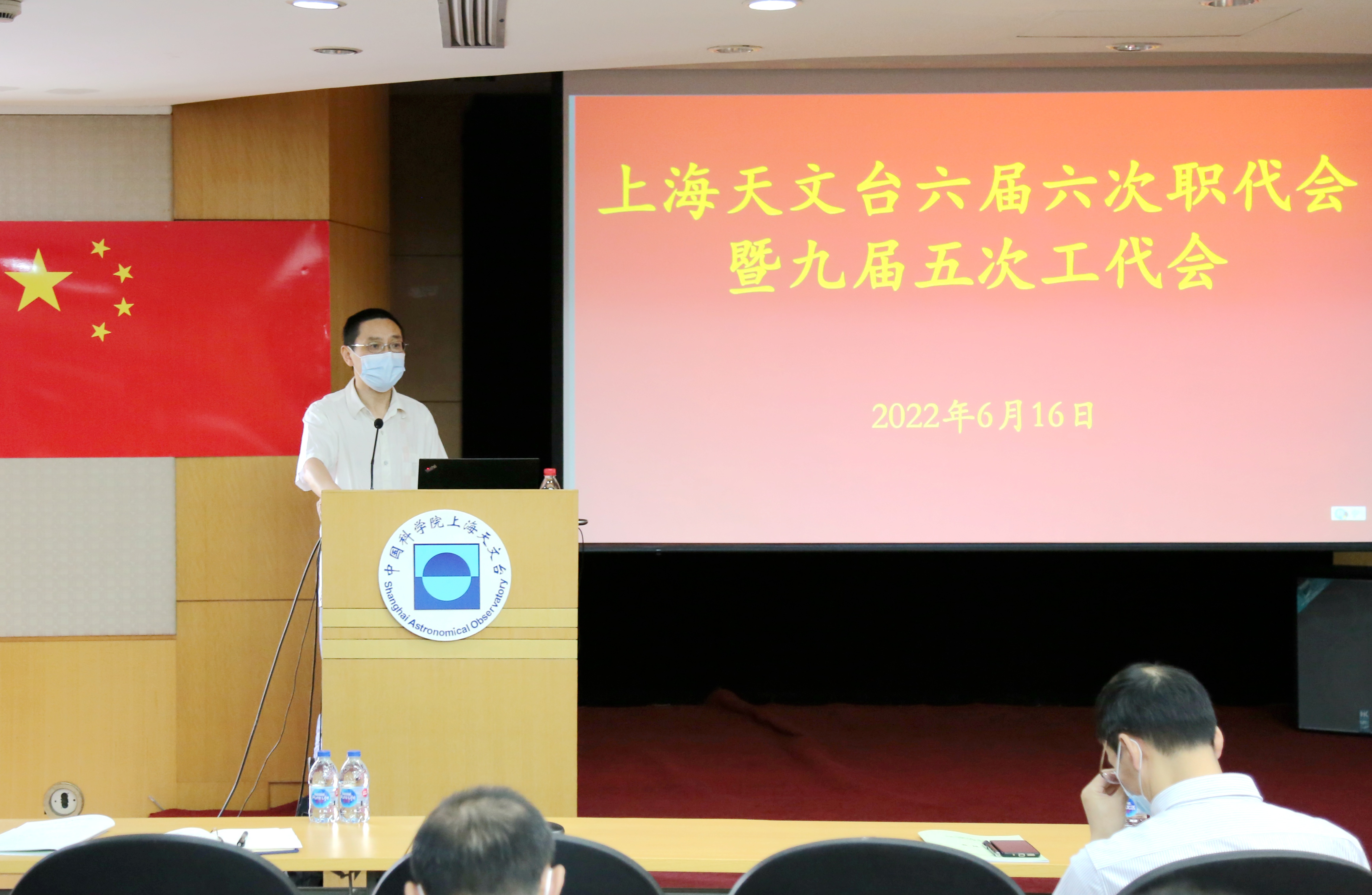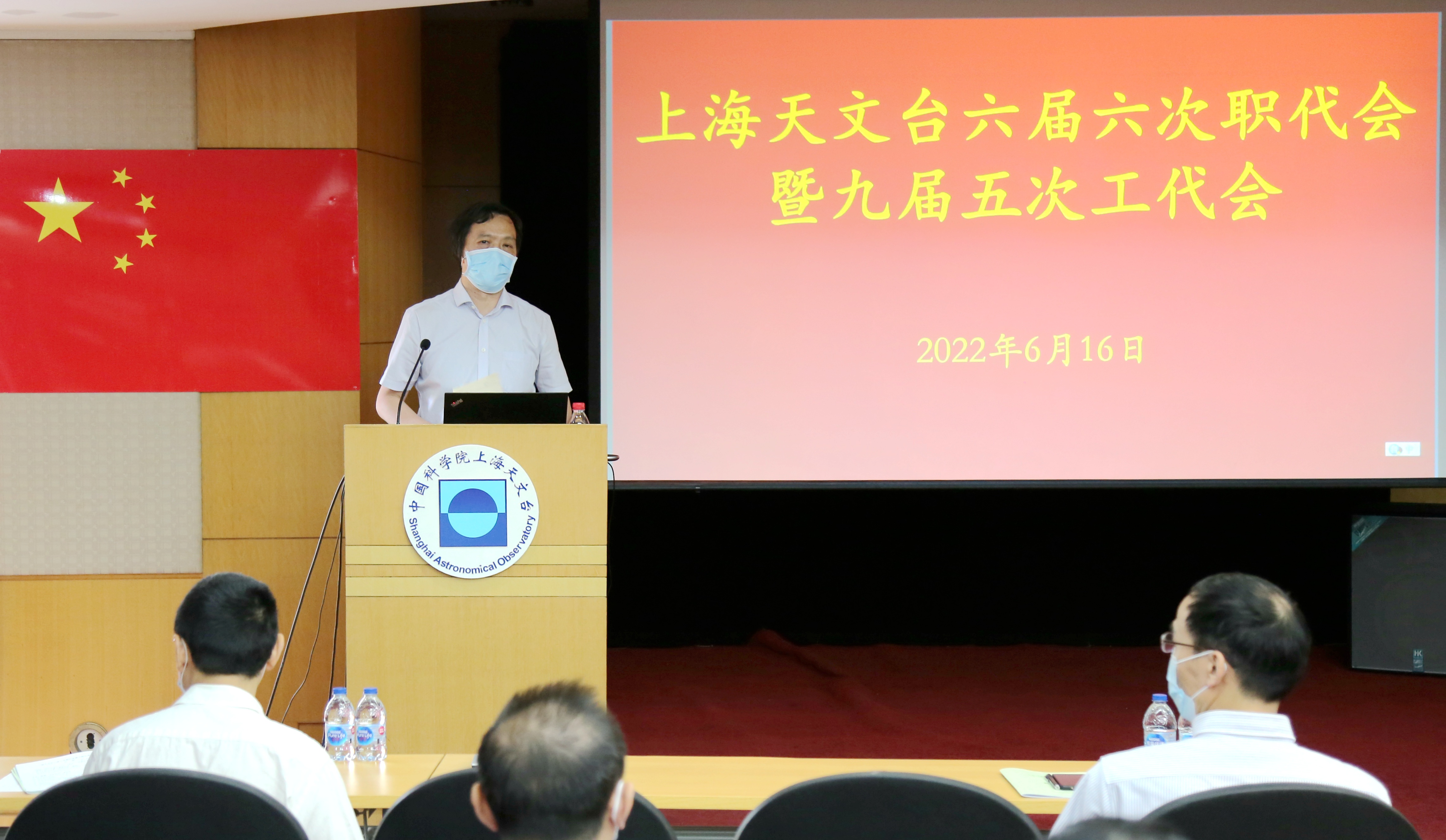 2022年6月16日,上海天文台召开六届六次职代会暨九届五次工代会,49位正式代表出席了会议,部分常驻佘山的正式代表在佘山科技园区分会场参加会议。考虑疫情因素,列席代表和其他职工及学生通过“桌面云视频会议系统”旁听了会议。会议在庄严的国歌声中拉开帷幕。