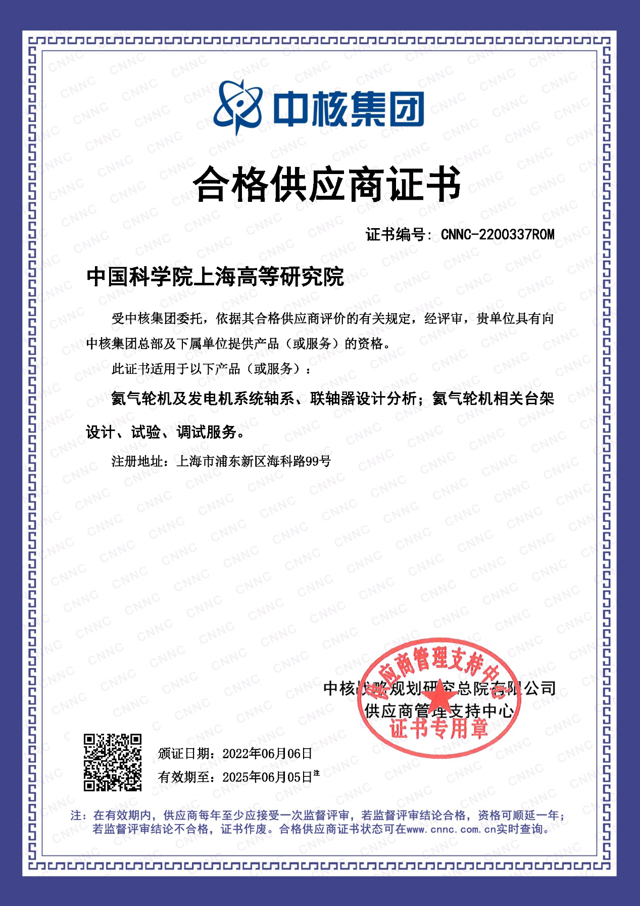 2022年5月13月至14日 ,受中核集团委托,兴原认证中心对上海高研院氦气轮机及相关技术的产品(或服务)进行了合格供应商资格审核。审核组专家严格按照《中国核工业集团公司合格供应商要求》、《中国核工业集团公司合格供应商判定规则》及其他适用的法律法规/标准和其他要求,通过沟通询问、查阅相关文件资料等方式,对上海高研院先进能源系统与装备研究与发展中心进行了全面评估。经过两天严格审查,“氦气轮机及发电机系统轴系、联轴器设计分析;氦气轮机相关台架设计、试验、调试服务”顺利通过兴原认证中心审核,被推荐为“中核集团合格供应商”。中核集团于6月6日向上海高研院颁发了《合格供应商证书》。