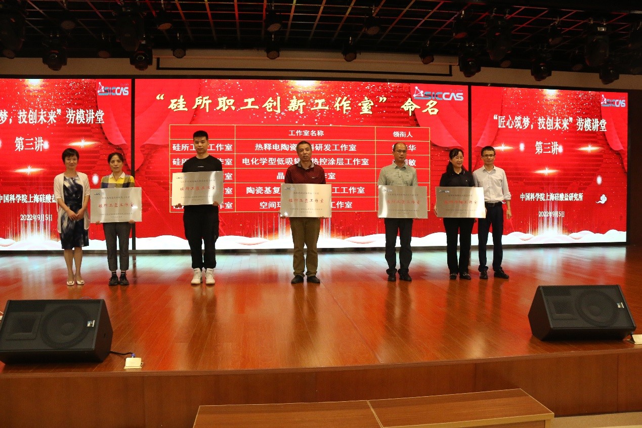 工会主席孙伟嬿、综合办公室(党委办公室)主任毛朝梁为“硅所职工创新工作室”授牌