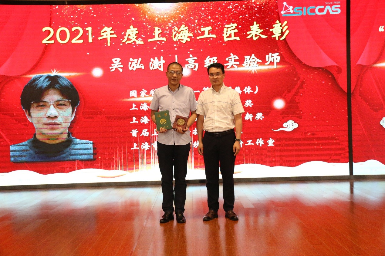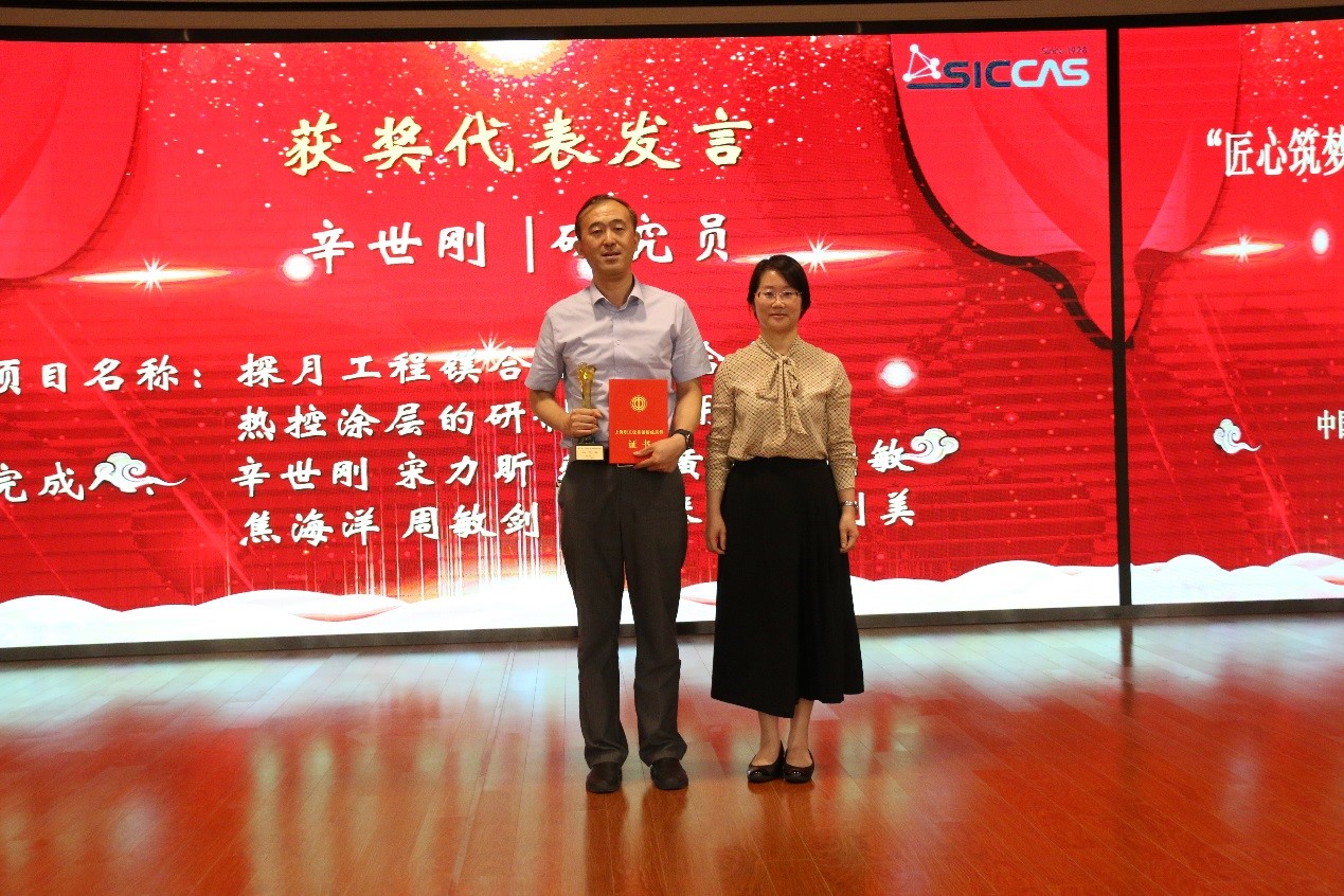 上海市总工会继续开展“上海工匠”培养选树活动,2021年命名了103位上海工匠,硅酸盐所吴泓澍高级实验师获此殊荣。朱熊为“上海工匠”获得者吴泓澍颁奖。上海硅酸盐所“探月工程镁合金、钛合金热控涂层的研制及应用”项目荣获第二届“上海职工优秀创新成果奖”二等奖。李晴暖为第二届“上海职工优秀创新成果奖”二等奖获得团队项目第一完成人辛世刚颁奖。辛世刚作交流发言,分享了用奋斗、责任、创新在自己的科研道路上的不懈努力,以新材料助力中国航天事业。