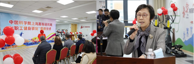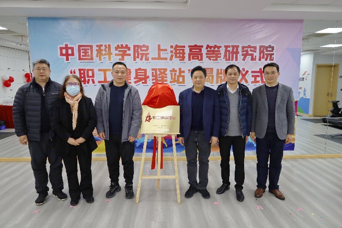 2月22日下午,高研院“职工健身驿站”正式揭牌,上海市总工会宣教部四级调研员余洪海、上海市体育局群体处副处长黄海松、上海市科技工会常务副主席李皓、中科院上海分院工会常务副主席、党建工作部部长朱熊、党群工作处薛芳、每步科技(上海)有限公司运营副总王慧玲、高研院院长黄政仁和党委书记、副院长李燕出席活动,揭牌仪式由高研院党委副书记、纪委书记、工会主席唐铮主持。