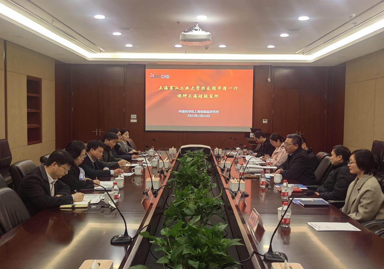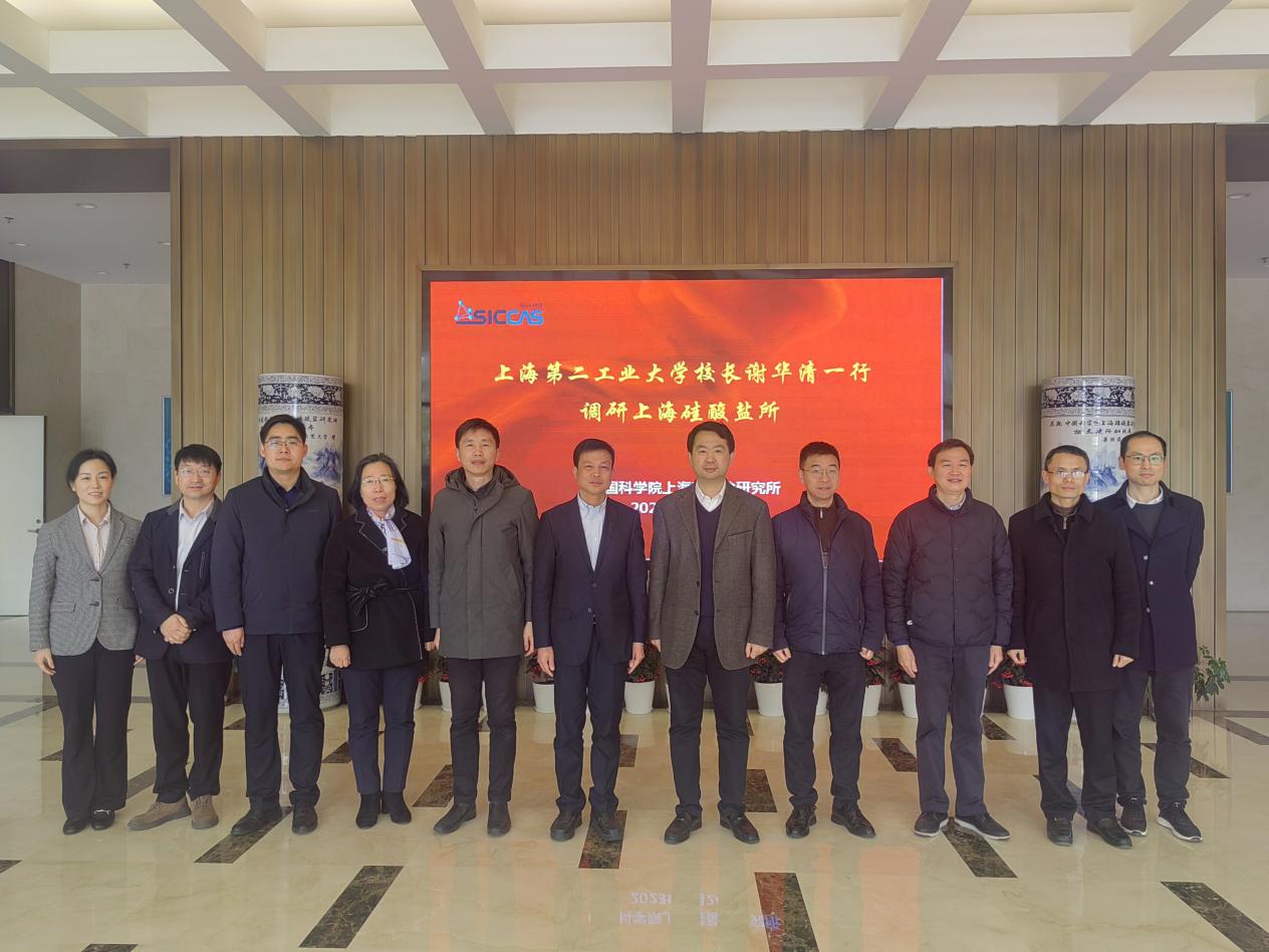 2月24日上午,上海第二工业大学校长谢华清一行调研中国科学院上海硅酸盐研究所,校长办公室主任邱钢、科研处处长徐海萍、研究生部主任崔立、能源与材料学院党委书记陈勇、能源与材料学院院长王元元一同参加调研。上海硅酸盐所副所长苏良碧,党委委员卓尚军,测试中心主任、纪委委员曾毅,党委办公室(所办公室)副主任周世亮,测试中心副主任、党支部书记钱荣,研究生部副主任、党总支部书记陆彩飞,科技综合处石超参加座谈会。上海硅酸盐所党委书记、副所长(主持工作)王东,党委办公室(所办公室)主任毛朝梁参加前期交流。