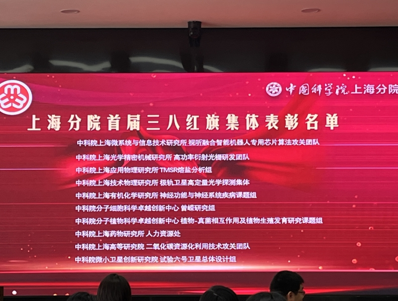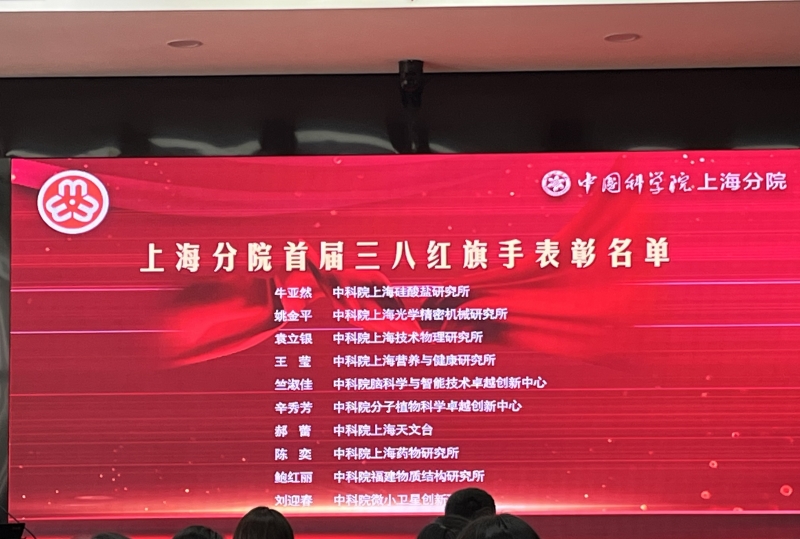 3月10日下午,上海分院妇委会举办了“巾帼展风采 建功新时代”中科院上海分院三八红旗手、三八红旗集体表彰大会暨首期“科苑巾帼讲堂”。经评选,中国科学院分子植物科学卓越创新中心辛秀芳研究员获得了“三八红旗手”荣誉称号,唐威华研究组获得了“三八红旗集体”荣誉称号。