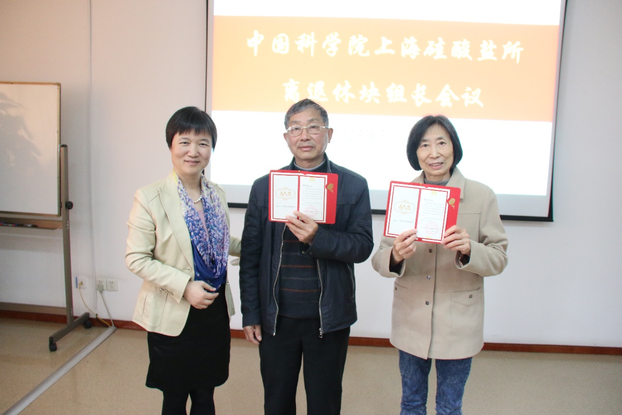 孙伟嬿向离任的块组长颁发了荣誉证书,感谢他们为硅酸盐所离退休工作付出的辛勤工作。离任块组长代表陈云仙、张惠根先后作了交流发言,深情回忆了担任块长十年间的点点滴滴。他们表示,在“两送”工作中,顶酷暑冒严寒为老同志送去关怀,得到老同志的认可是最好的肯定,再累也很开心。两位代表对新上任的块组长也提出了殷切期望。