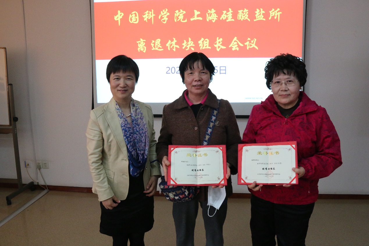 会上表彰了2019-2021年度上海市科技系统优秀退休块组长。孙伟嬿向李静建、张秀荣两位块长颁发了荣誉证书。张秀荣、李静建也先后作了交流发言,分享了做块组长工作中一个个感人的故事,她们用心用情、细致耐心,把离退休职工当亲人,付出耕耘收获幸福,为硅酸盐所的离退休工作作出了自己的贡献,为研究所改革创新发展添砖加瓦。