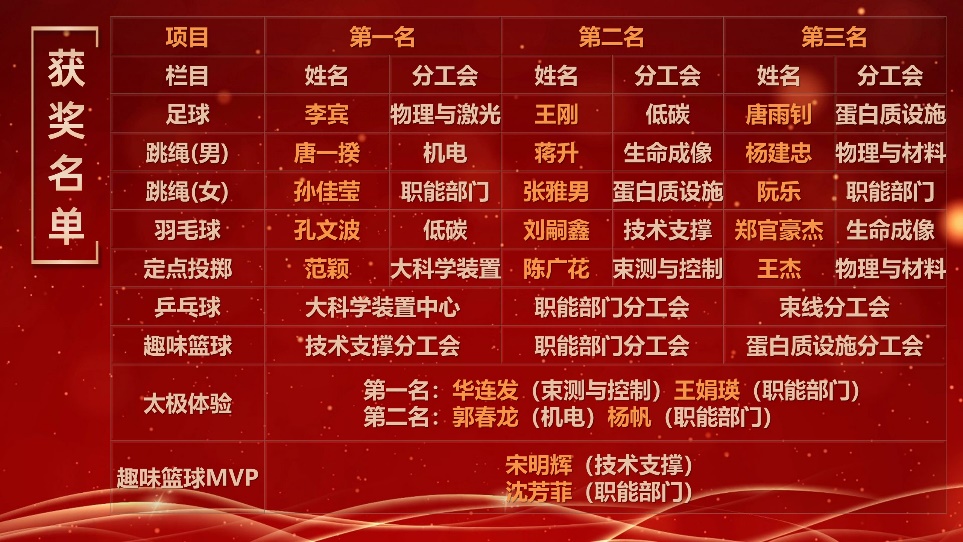 活动伊始,“趣味篮球赛”冠亚季军总决赛率先火热开赛,黄政仁为比赛开球,高高抛起的篮球迅速点燃了现场氛围,运动健儿们在赛场上奋勇拼搏,一记记精准的投篮惊艳全场,现场热力四射、高潮迭起。经过激烈的角逐,技术支撑分工会突出重围,勇夺冠军,职能部门分工会和蛋白质设施分工会分获第二名和第三名。