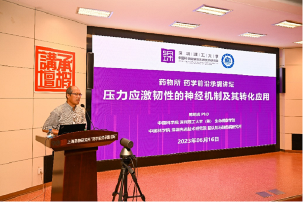 2023年6月16日,上海药物所“药学前沿承嘏讲坛”第五十三讲在承嘏厅举行。深圳理工大学(筹)生命健康学院韩明虎教授应邀作了题为“压力应激韧性的神经机制及其转化应用”的专题报告。原创新药研究全国重点实验室副主任程震研究员主持报告会,药物所总部及中山、烟台研究基地百余名科研人员和研究生参会。