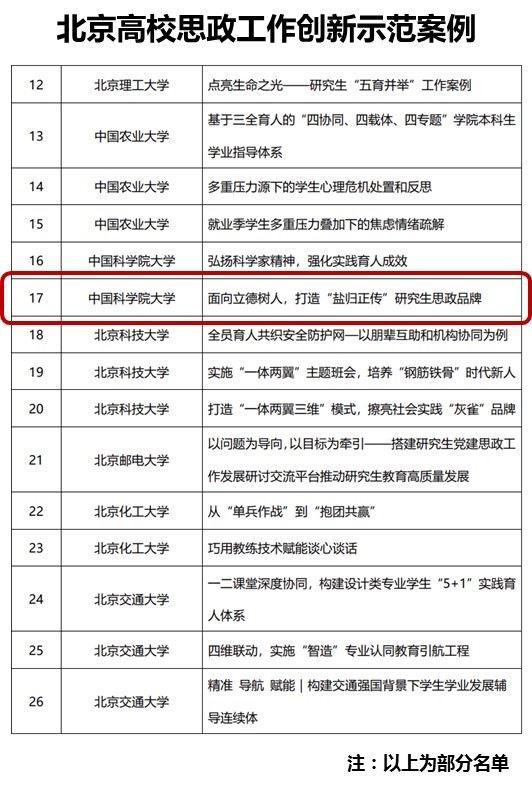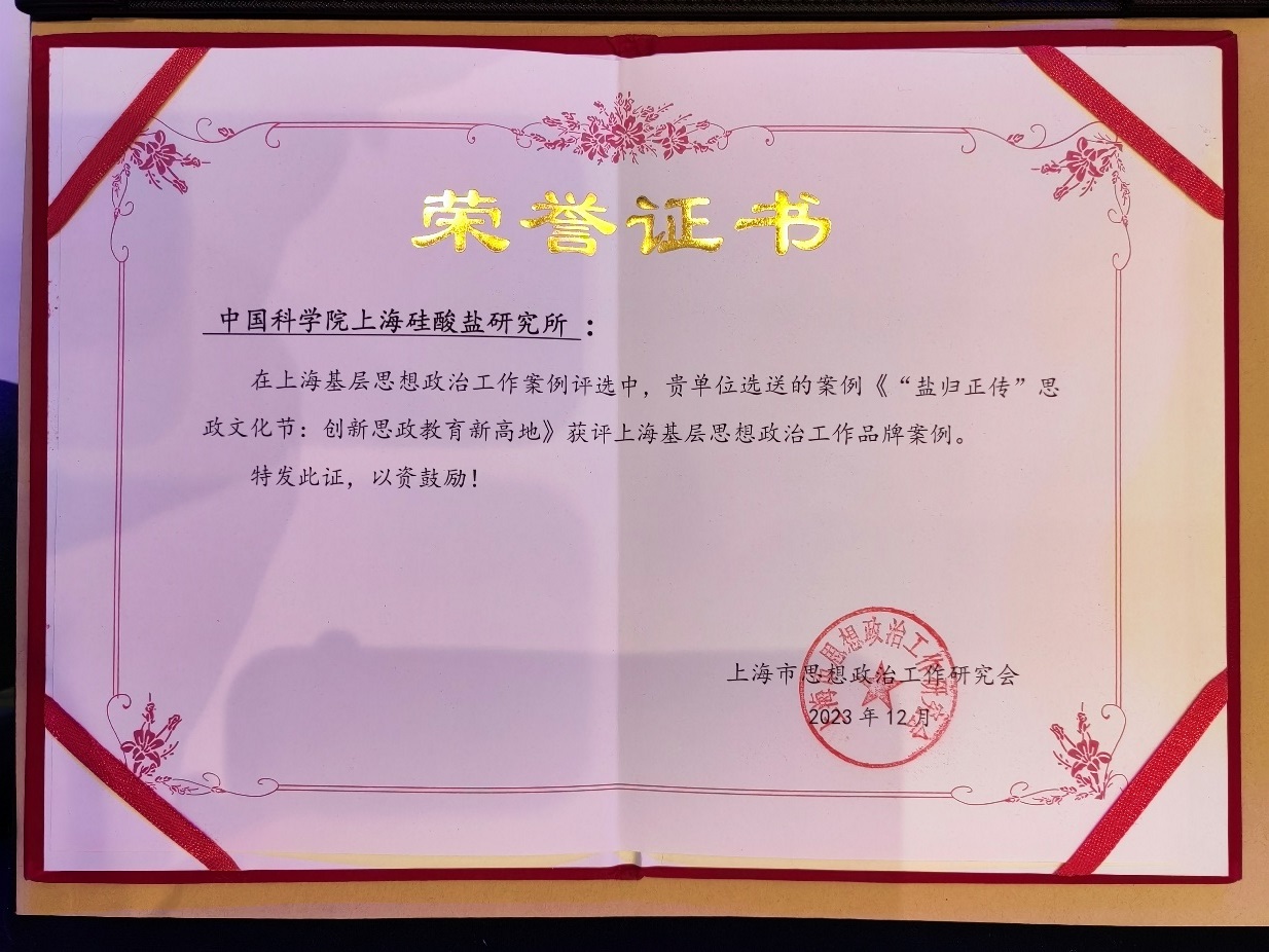 12月14日,由中共上海市委宣传部指导,上海市思想政治工作研究会主办的上海思政大讲堂启动仪式暨首届高级政工师论坛活动在上海中心举行。中国思想政治工作研究会兼职副会长、中国科学院院士褚君浩,中国思想政治工作研究会副秘书长洪波,市委宣传部副部长、市文明办主任、市政研会常务副会长潘敏等领导出席活动。活动现场启动了“上海基层思想政治工作、人文关怀心理服务工作品牌案例巡展”及线上展,中国科学院上海硅酸盐研究所《“盐归正传”思政文化节:创新思政教育新高地》案例入选上海基层思想政治工作20个品牌案例之一并参加巡展。12月13日,中共北京市委教育工作委员会公布新时代北京高校思想政治工作创新示范项目遴选结果,中国科学院大学推荐的上海硅酸盐所案例《面向立德树人,打造“盐归正传”研究生思政品牌》入选北京高校思政工作90个创新示范案例之一。