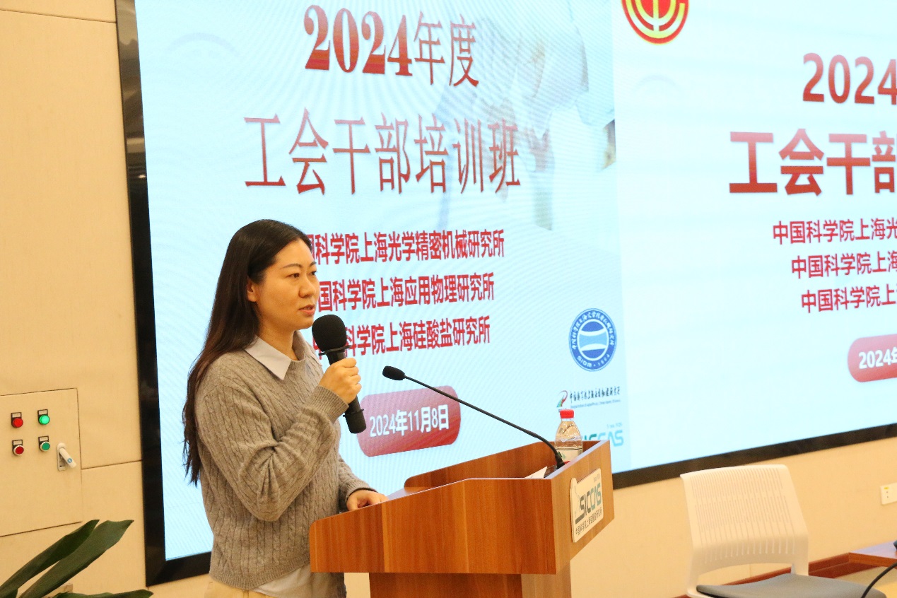 在工会工作交流阶段,上海光机所工会常务副主席胡卫芳、上海应物所工会副主席顾储洁和上海硅酸盐所工会主席孙伟嬿分别作了《以奋斗者为本,建尚光美好家园》《聚力攻坚、“核”力同行——为加快抢占科技制高点凝聚磅礴力量》《如何做好工会干部》的工作报告。