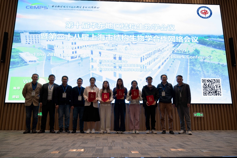 值得一提的是,会议精心设立了青年科学家优秀报告奖以激励科研成果突出的博士后和研究生。经过专家们的严格评审筛选,包括分子植物卓越中心的安宁、于华等 5 位同学脱颖而出,获得此项荣誉。在颁奖环节,张余与上海市生物物理学会理事长张鹏研究员等人一同为获奖者颁发了荣誉奖项,勉励各位获奖人再接再厉,未来取得更大成绩。