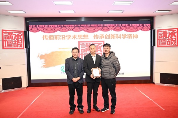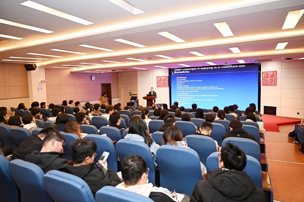 报告中,张康分享了他们团队的一系列研究成果。他以“预训练迁移学习”在医疗场景上的运用为切入点,讲解了人工智能可以通过多接口整合患者信息,为医生和患者提供海量的数据支撑,以缓解全国医疗资源分配不均和精准医疗需求等问题。张康指出,基于大数据的人工智能系统在医疗领域展现出巨大潜力,利用AI辅助CT影像,实现了对武汉新冠肺炎的精准诊断、定量评估及重症预测。其团队在2018年首次使用算法实现三类影像学数据和眼底等疾病的智能分类。此外,他还分享了团队的最新研究成果,包括团队运用大规模AI模型和大语言模型(LLMs)提升医疗数字孪生的预测能力和诊断准确性;通过联邦学习和区块链技术保障数据隐私安全,解决数据孤岛难题,促进数据共享合作。张康表示,数字孪生技术通过持续健康监控,能为医患提供动态的健康指导,优化治疗策略,降低医疗成本,是未来医疗领域的必要技术。报告结束后,与会师生进行了深入的讨论交流。原创新药研究全国重点实验室主任高召兵为张康颁发了讲坛纪念证书。