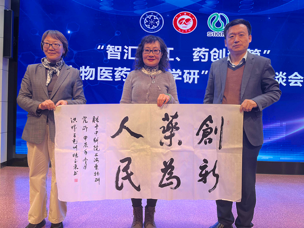 会上,一带一路国礼书法家、民盟中央书画院理事杨玉来女士向上海药物所赠送“创新药、为人民”书法作品,将科学与艺术完美融合。
