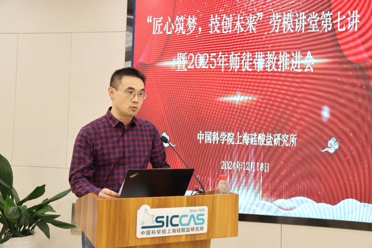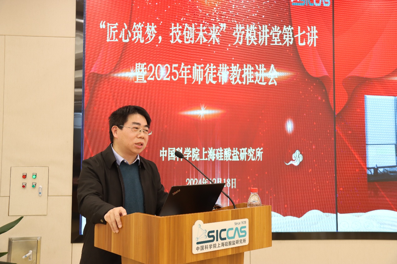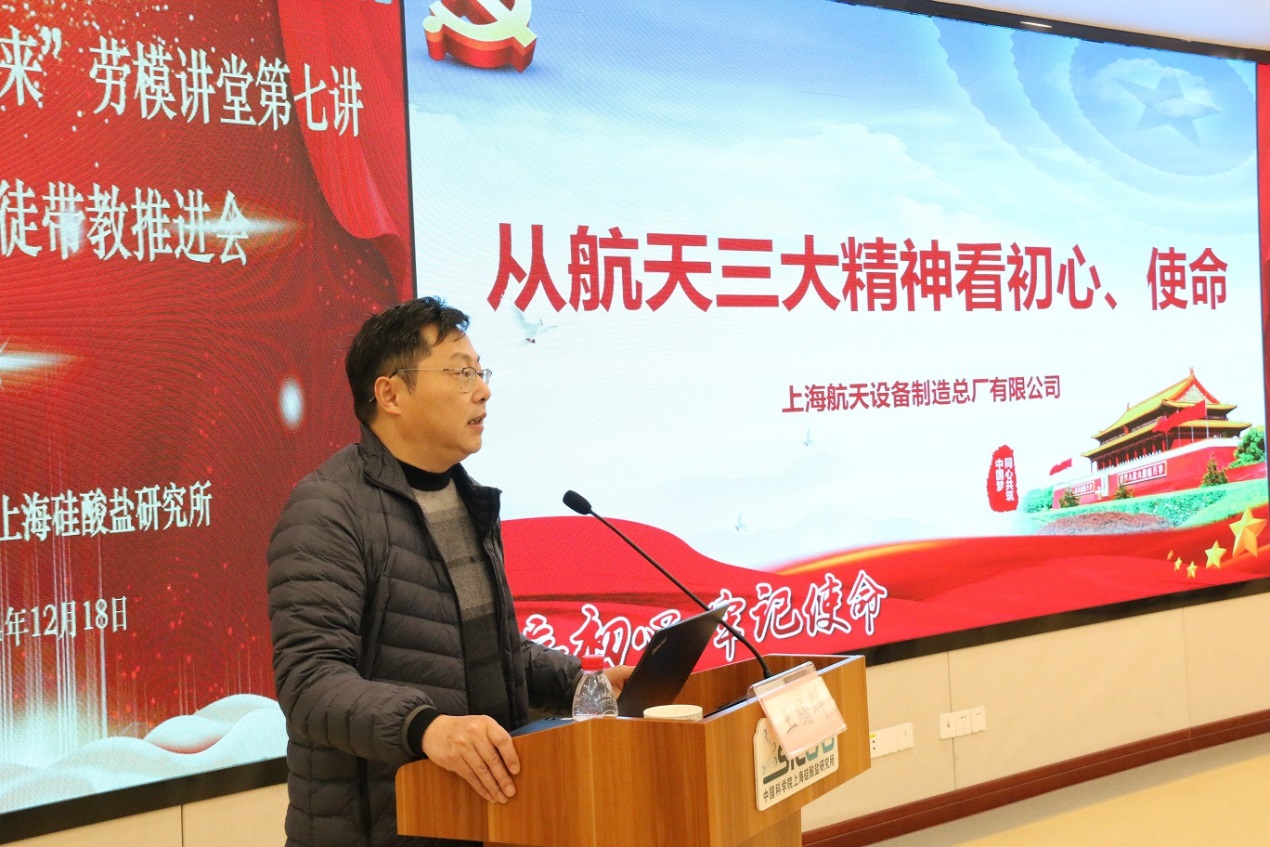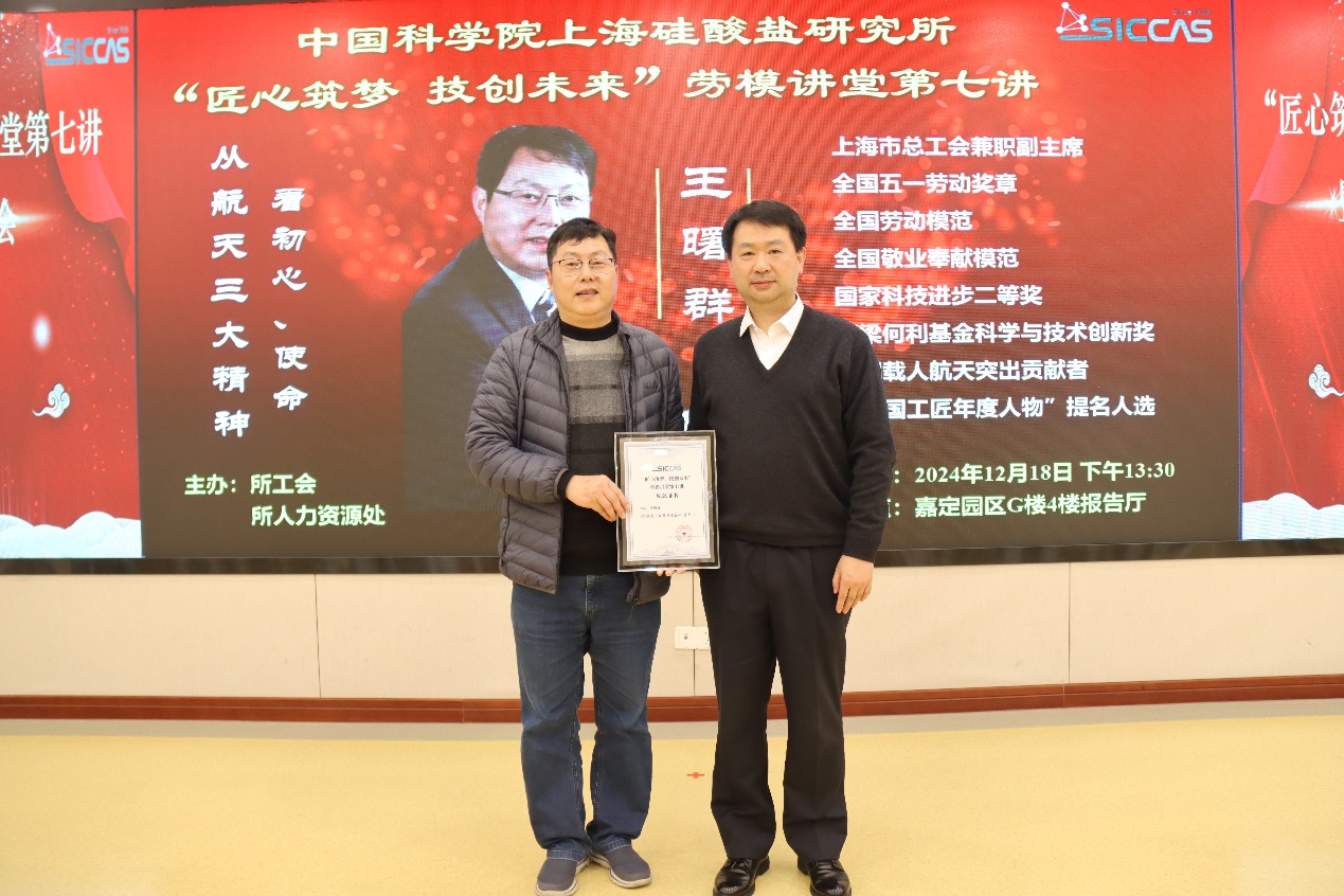 为深入学习贯彻党的二十届三中全会精神以及习近平总书记关于“要大力弘扬劳模精神、劳动精神、工匠精神,发挥好劳模工匠示范引领作用,激励广大职工在辛勤劳动、诚实劳动、创造性劳动中成就梦想”的重要讲话精神,12月18日,中国科学院上海硅酸盐研究所举行“匠心筑梦,技创未来”劳模讲堂第七讲暨2025年师徒结对推进会。全国劳动模范、上海市总工会兼职副主席、上海航天局工会兼职副主席、上海航天设备制造总厂有限公司九分厂(飞行器总装分厂)总装工、首席技师王曙群应邀做主旨报告。中国工程院院士、全国先进工作者、上海硅酸盐所研究员董绍明,上海市科技工会常务副主席斯海雄,上海硅酸盐所党委书记王东出席会议,所工会委员、部门支部书记、工会干部、2024年度优秀师徒、技能大赛获奖人员以及2025年度师徒结对成员等近百人参加了会议。会议由所工会主席孙伟嬿主持。