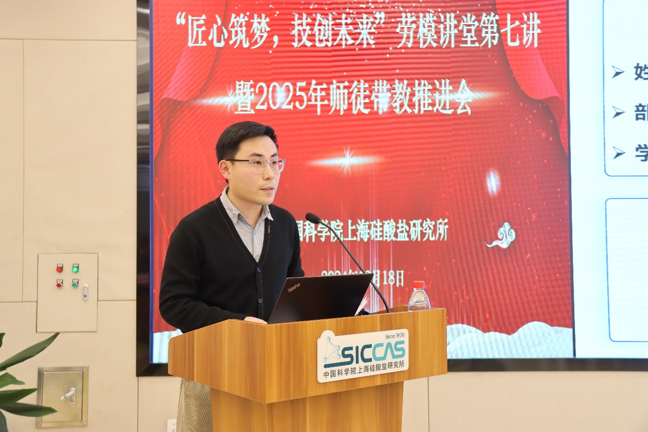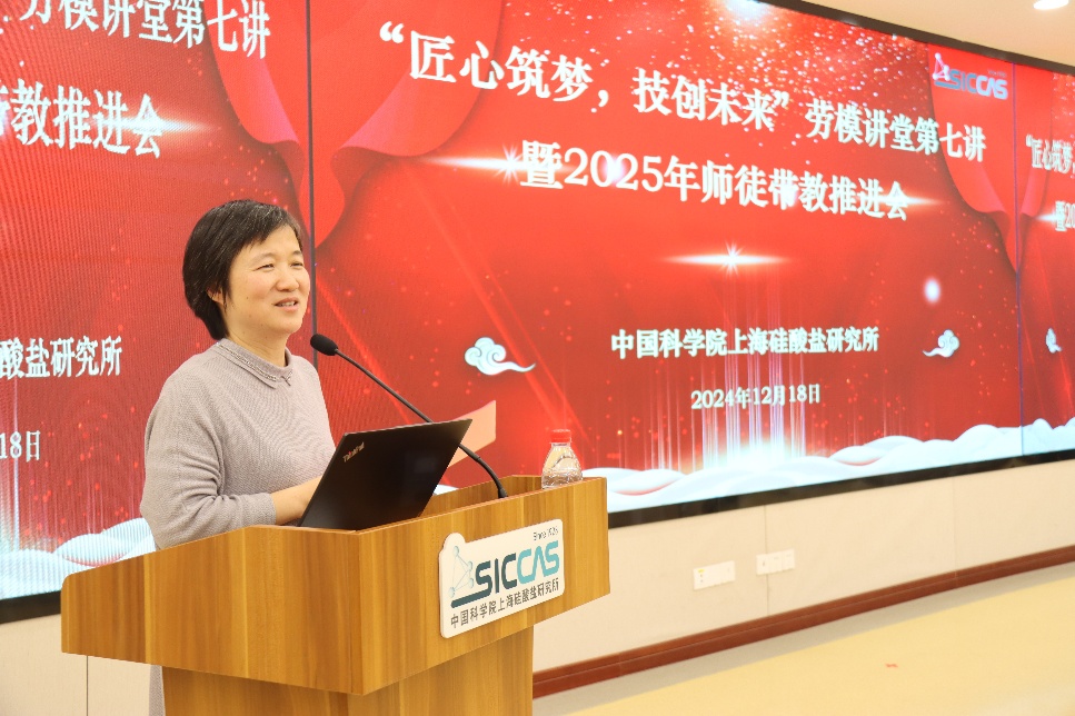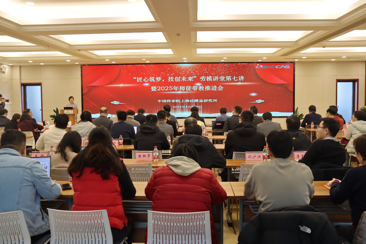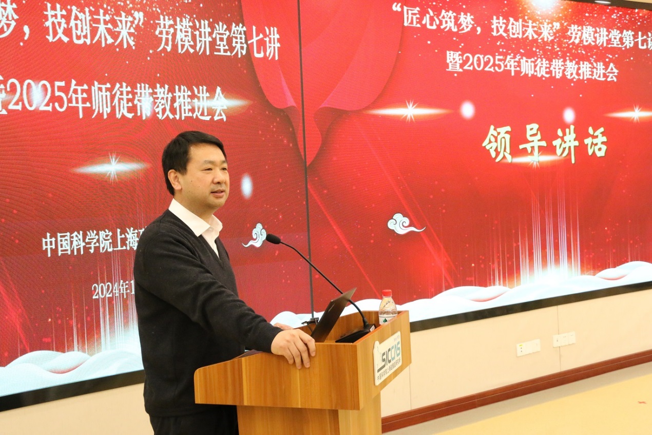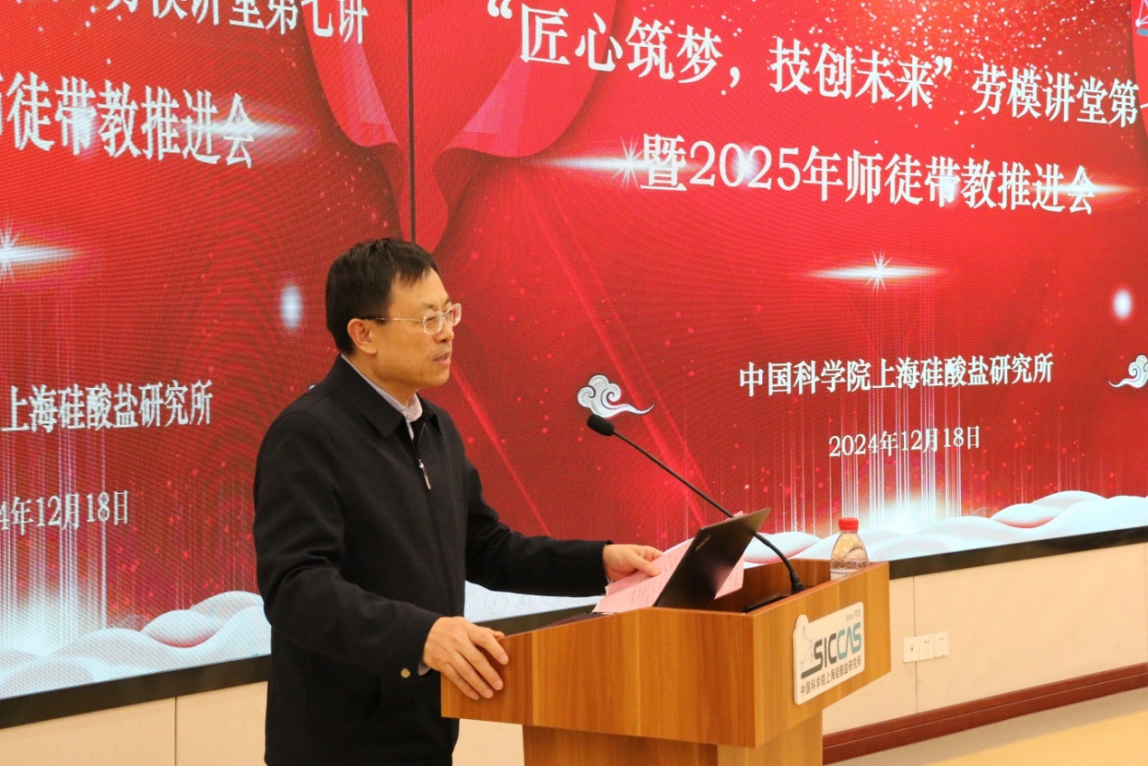 为深入学习贯彻党的二十届三中全会精神以及习近平总书记关于“要大力弘扬劳模精神、劳动精神、工匠精神,发挥好劳模工匠示范引领作用,激励广大职工在辛勤劳动、诚实劳动、创造性劳动中成就梦想”的重要讲话精神,12月18日,中国科学院上海硅酸盐研究所举行“匠心筑梦,技创未来”劳模讲堂第七讲暨2025年师徒结对推进会。全国劳动模范、上海市总工会兼职副主席、上海航天局工会兼职副主席、上海航天设备制造总厂有限公司九分厂(飞行器总装分厂)总装工、首席技师王曙群应邀做主旨报告。中国工程院院士、全国先进工作者、上海硅酸盐所研究员董绍明,上海市科技工会常务副主席斯海雄,上海硅酸盐所党委书记王东出席会议,所工会委员、部门支部书记、工会干部、2024年度优秀师徒、技能大赛获奖人员以及2025年度师徒结对成员等近百人参加了会议。会议由所工会主席孙伟嬿主持。
