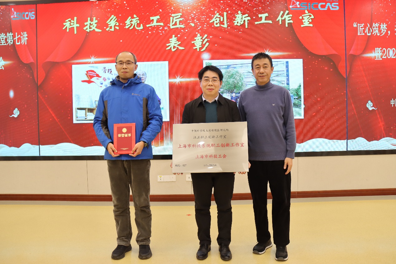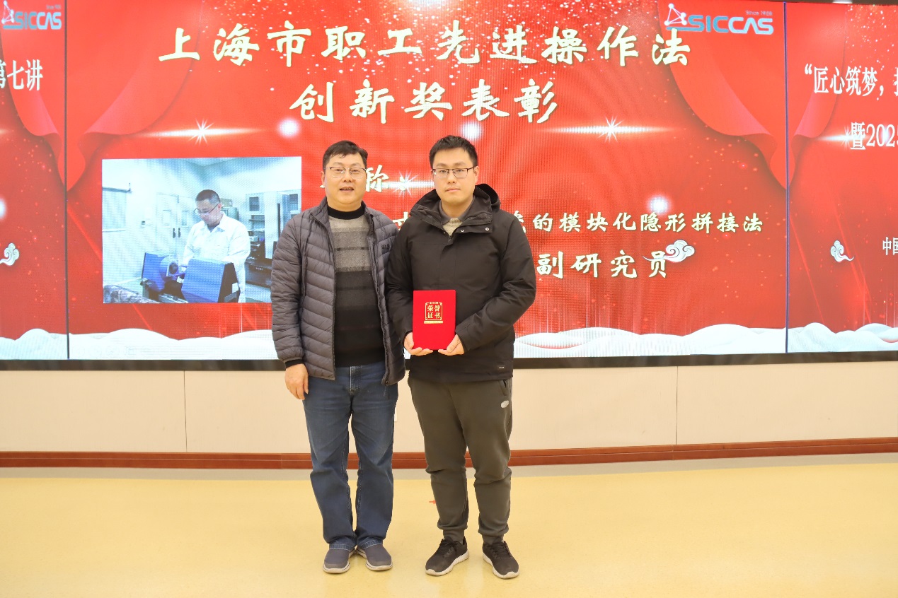 斯海雄为2024年度上海市科技系统工匠获得者-结构陶瓷与复合材料工程研究中心何平正高级工程师颁奖,为2024年度上海市科技系统职工创新工作室-汪正创新工作室授牌。王曙群为2024年度上海市职工先进操作法创新奖获得者“大尺寸透明陶瓷的模块化隐形拼接法”-氧化物透明陶瓷课题组邓佳杰颁奖。