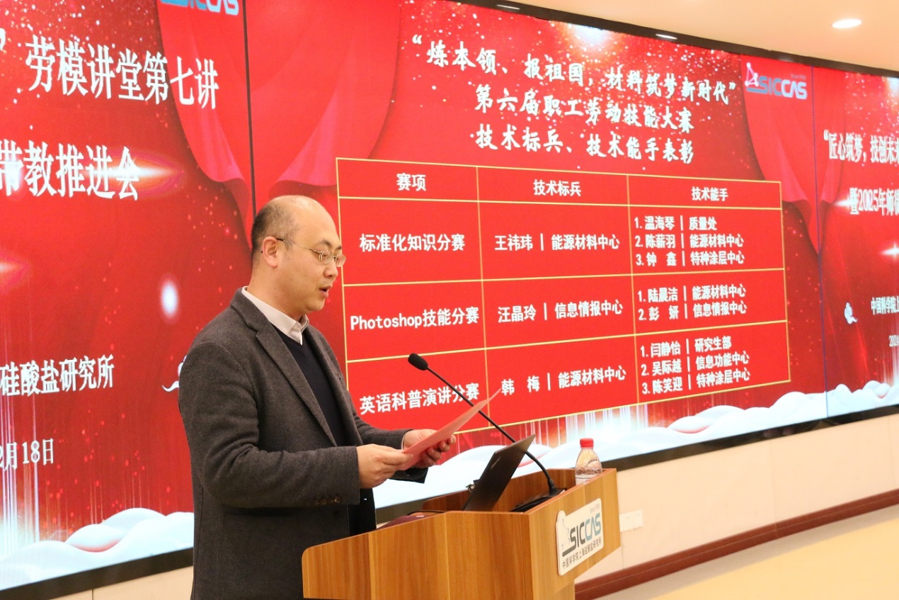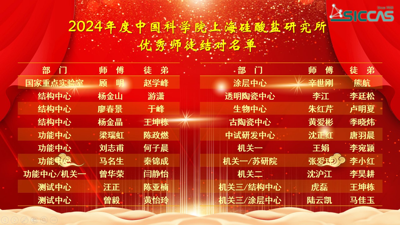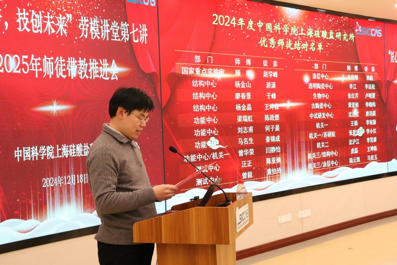所工会委员、人工晶体研究中心主任刘学超宣读了2024年度优秀师徒表彰决定,党委办公室主任、所办公室主任毛朝梁,新材料中试研发中心党支部书记袁兰英、能源材料研究中心党支部书记张涛、机关三党支部书记宋桂兰、特种无机涂层中心党支部书记孟佳、无机材料分析测试中心党支部书记钱荣、机关二党支部书记刘军、结构陶瓷与复合材料工程研究中心党支部书记殷杰为20对优秀师徒颁奖。