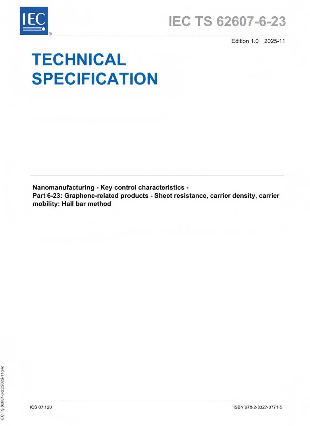 近日,国际电工委员会纳米电工产品与系统技术委员会(IEC/TC 113)正式发布国际标准IEC TS 62607-6-23:2025 Nanomanufacturing - Key control characteristics - Part 6-23: Graphene-related products - Sheet resistance, carrier density, carrier mobility: Hall bar method(纳米制造 - 关键控制特性 - 第6-23部分:石墨烯相关产品 – 方块电阻,载流子浓度,载流子迁移率:霍尔棒法)。该标准由中国科学院上海微系统与信息技术研究所王浩敏研究团队牵头提案并组织编制,国家纳米科学中心、深圳市标准技术研究院、泰州巨纳新能源有限公司以及来自德国、韩国、加拿大的专家参与制定工作。