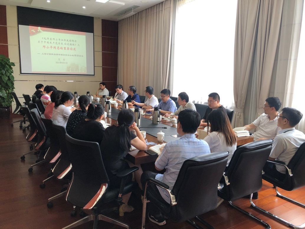 9月1日下午,上海分院机关青年理论学习小组举行党史学习教育第11次专题学习会。上海分院分党组副书记、纪检组组长,沪区党委副书记、纪委书记王东领学《毛泽东邓小平江泽民胡锦涛关于中国共产党历史论述摘编》中“邓小平重要论述”章节。20余名上海分院青年理论学习小组成员参加学习交流。上海分院副院长、机关与直属单位党委书记赵健出席。
