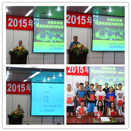 8月27日,中科院海西研究院在化学楼四楼报告厅举行2015年度研究生开学典礼,这是海西研究院首次为新入学的研究生们举办开学典礼。吴新涛院士、洪茂椿院士,福建物构所所长曹荣、副所长卢灿忠以及福建卢嘉锡科学教育基金会秘书长卢葛覃等出席了典礼。海西研究院2014级全体硕士研究生、海西联培生以及2015级博士生等近180人参加了活动。开学典礼由研究生部主任张婧主持。