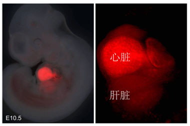 E10.5胚胎大体标本,红色标记是心内膜,在心脏和肝脏中可以检测到心内膜来源的细胞。