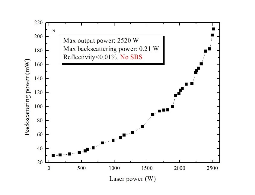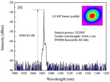 研究人员采用自研光纤光栅、高功率合束器、包层光滤除器等核心器件,基于光纤光栅级联滤波、线宽操控、放大级参数控制和光纤模式控制等关键技术,在纤芯20μm,NA=0.06的光纤中突破了Jena大学研究组认为的<50GHz窄线宽近衍射极限光纤激光的输出功率的极限,实现功率2.52kW,线宽0.18 nm(50 GHz),中心波长1064.1nm的近衍射极限光纤激光输出。该激光器采用全光纤三级放大MOPA结构,结构紧凑,具有很好的稳定性。光束质量在2kW时测试为Mx2=1.191,My2=1.186。没有观察到受激布里渊散射、受激拉曼散射和模式不稳定等非线性现象,通过提升泵浦功率水平,激光输出功率有望进一步提升。
