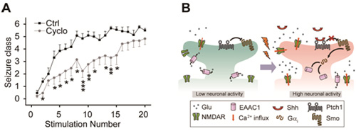 神经信号转导实验室的工作发现,Sonic hedgehog (Shh)特异地在癫痫刺激下被分泌出来,并且抑制Shh信号通路有很好的抗癫痫作用。进一步研究发现,Shh通过其下游信号分子Smoothened(Smo)和Gai负向调节谷氨酸转运体在细胞膜上的表达,从而增加细胞外的谷氨酸浓度,导致癫痫的发生发展。在小鼠电点燃癫痫模型和pilocarpine诱导的自发癫痫模型中,Shh的抑制剂都有很好的抑制作用。这不但揭示了Shh在成年动物中枢神经系统的新功能,也为治疗癫痫提供了新的方向和思路。
