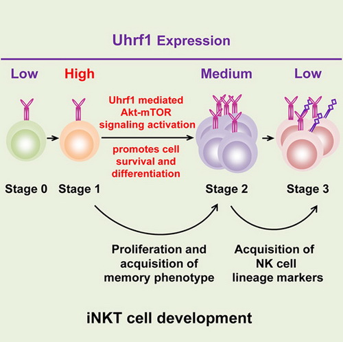在刘小龙研究员的指导下,其博士研究生崔玉、博士后陈旭峰等的研究表明,Uhrf1在处于阶段1的iNKT细胞中高表达;在T淋巴细胞中特异性敲除Uhrf1后,iNKT细胞的分化被阻滞在阶段1且存活能力降低,最终导致在脾脏和肝脏中成熟的iNKT细胞数目显著减少。进一步的机制研究发现,代谢相关的信号通路在敲除Uhrf1后发生变化,Akt-mTOR信号传导减弱,而过表达活化的Akt可以恢复iNKT细胞的分化成熟缺陷。该研究揭示了Uhrf1调控iNKT细胞分化和存活的关键作用及分子机制,增进了对于iNKT细胞分化与功能调控的认识。