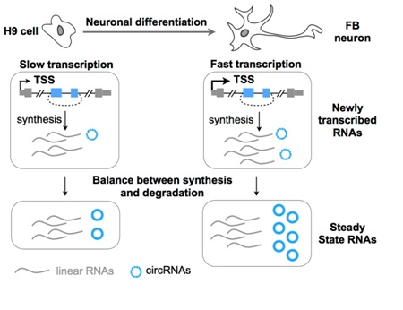 该工作利用和发展4sUDRB纯化新生转录本系统监测环形RNA生成与RNA聚合酶Ⅱ转录的动态偶联过程,首次证明细胞内反向剪接RNA成环与顺序剪接相比发生效率非常低;大多数RNA成环发生在转录后水平;能够发生RNA成环的基因较非成环的基因转录速度更快,提示外显子RNA成环效率与其所在基因的RNA聚合酶II转录速度相偶联。利用基因组编辑技术内源敲除顺式调控元件,发现即使加快基因转录速度仍无法诱导RNA成环,进一步表明环形RNA是细胞精细调控的产物。值得一提的是,此项工作还证明环形RNA闭合环状的特殊结构赋予其高稳定性的特点,使之成为一种半衰期极长的“不朽的环形RNA (immortal circRNA) ”。因此尽管环形RNA在转录水平产生效率较低,但通过累积效应可以达到较高的表达水平。而这一研究结果也在理论水平解释了人源胚胎干细胞神经分化过程中环形RNA表达显著上调这一现象,即神经细胞极慢的分裂速度推进了环形RNA在神经细胞中的累积。这一以实验数据为基础的系统研究,丰富了人们对环形RNA的认识,阐释了环形RNA生成与RNA转录的关系,为进一步研究环形RNA的功能作用奠定基础。