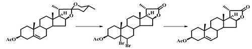 众所周知,胆甾醇类天然产物属于甾族化合物中结构比较复杂的种类,虽然经过有机合成化学家艰苦努力,从已知简单化工原料合成甾族化合物基本骨架的策略至今难以推广应用。目前仍然沿袭以易得的天然甾醇为起始原料的半合成策略。常见用于合成胆甾醇类天然产物的原料有大豆甾醇、麦角甾醇、胆酸和甾体皂甙元,其中甾体皂甙元产量最大,一直作为是我国甾体药物工业的基本原料。文献上已报道的利用大豆甾醇、麦角甾醇和胆酸合成胆甾醇类天然产物的策略和方法是首先降解它们成为相应的胆甾-22-醛,然后引入相应的侧链,此等合成策略不适合其D环上有官能团的分子。文献报道利用甾体皂甙元合成胆甾醇类天然产物的策略和方法是:通过修饰其相应氧化降解产物孕烯酮醇或去氢表雄酮的D环并引入相应侧链,但步骤繁多、路线冗长、效率低下。甾体-16-羟基-22-酸内酯其C16-羟基可用于D环修饰改造,C22-内酯可用于侧链合成,是高效、集成合成胆甾醇类天然产物最理想的关键合成中间体(图1)。