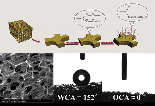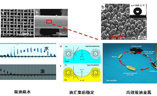 为解决这些问题,实现高效、快速的溢油应急处理,中科院宁波材料所海洋功能材料研究团队曾志翔、王刚等研究人员,研制了系列亲油疏水材料,并基于这些材料开发新型智能溢油应急装置。通过对材料的孔径控制、结构设计及表面能调控(Chemical Communications, 2013. 49(24): p. 2424-2426.;ACS Applied Materials & Interfaces, 2014. 6(2): p. 1053-1060;RSC Advances, 2015. 5(35): p. 27242-27248),研制了系列亲油疏水金属和高分子材料(ACS Applied Materials & Interfaces, 2015 7 (47), p. 26184-26194; Polymer Chemistry, 2014, 5(20): 5942-5948;专利CN201310703409.5、CN201510392570.4),分别实现对水上原油、重油、轻油、柴油汽油、有机化学液体及水下有机化学液体等的高效吸附与回收;针对分散在水中的乳化油,研制了疏油亲水乳化油分离材料(Green Chemistry, 2015,17.3093-3101、专利CN201410778473.4)。此外,为适应苛刻的海洋环境,研制了高耐蚀涂层(RSC Advances, 2016, 6, 40641-40649)。