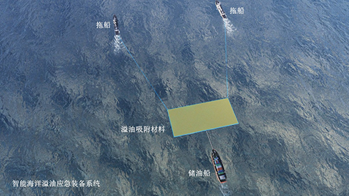 基于研制的吸油网和吸油多孔材料,海洋功能材料研究团队正在联合上海北斗产业园区相关企业开发5万㎡的智能海洋溢油应急装备系统。该智能溢油应急系统能够利用北斗导航系统和无人机,通过溢油海域图像处理系统检测溢油事件。当发现溢油时,系统会选择相应溢油回收装置,并自动指挥无人船及溢油回收装置前往溢油事故地点,进行海域溢油事故的处理。由于亲油疏水材料的超疏水特性,其在水面中拖行时具有极低的阻力,因此该系统采用两艘无人船将吸附材料高速拖行至溢油事故地点。吸附材料内置仿生吸油管道,网状结构体,管道泵,两级提纯系统,在线油含量检测系统组成。材料吸附油渍后,通过管道泵,逐级进入提纯储油囊,利用储油囊中的超疏油-超亲水材料,对油进行逐级分离与提纯,最后运至储油船,吸附材料外层采用网状柔性纤维结构,防止波浪打散或损坏材料,在线监测装置对吸油后的海水进行在线检查,检查海域水质是否达标,如果海域水质不达标,系统将再次进行清理。