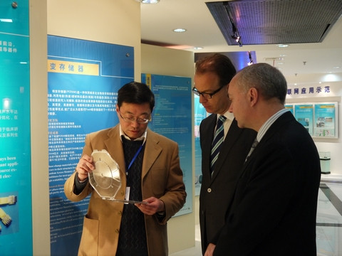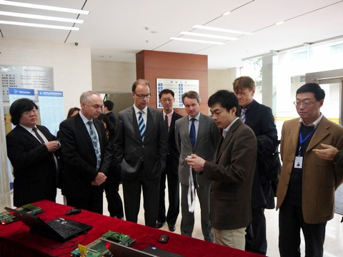 上海微系统所党委书记、副所长齐鸣、党委副书记、纪委书记俞跃辉、所长助理王营冠、五室副主任田彤研究员、上海科委国际合作处副处长刘海峰、IMEC CEO Luc Van den hove博士,荷兰驻中国使馆科技参赞 Jan Reint Smit, 荷兰驻上海领事馆总领事Peter Potman和科技参赞Jaap van Etten以及IMEC China 总裁高腾博士参加了揭牌仪式,揭牌仪式由俞跃辉书记主持,齐鸣书记和Peter Potman博士为实验室揭牌。田彤研究员介绍了联合实验室组建的主导思想、体系架构、实验装备条件以及技术发展路线图。高腾总裁介绍了IMEC HOLST Center 的研究情况,Peter Potman博士介绍了荷兰与中国的双边合作政策。