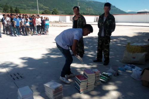 文具送达凉山彝族自治州越西县瓦岩乡,新建职校的首批学生正在领取各地寄来的文具用品