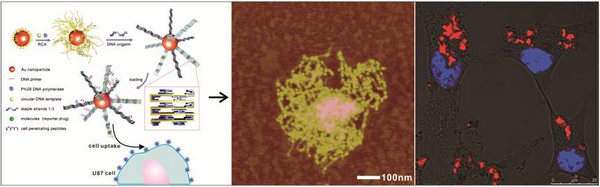 纳米生物结构的稳定性及负载的高效性是其在生物医学应用的关键。近日,中国科学院上海应用物理研究所与上海纳米技术及应用国家工程中心、上海交通大学合作,将纳米滚环扩增技术与DNA折纸术相结合,实现了DNA分子在纳米生物界面上的有序生长与折叠,构建成一种三维的纳米生物复合结构。在此基础上实现了多种生物分子在该结构上的负载,并展示出在细胞成像和细胞内药物输送的优越性能。这一纳米生物复合结构兼具无机纳米材料的刚性和生物材料的柔性,有望为细胞水平上的癌症诊治提供新型的信号分子和药物载体。相关研究结果最近发表于Angew. Chem. Int. Ed.( 2015, 127, 2461 –2465)。