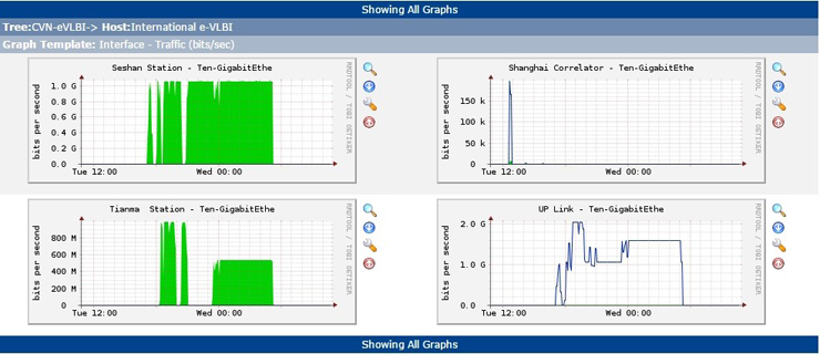 2015年4月14日17:00(BJT)起,我台天马望远镜(65米射电望远镜)与佘山25米望远镜参加L波段的欧洲VLBI网的实时VLBI(e-VLBI)常规试验(代码EP096A)获得成功。作为欧洲网的一次常规试验,此次的观测模式为1Gbps传输,目的地是位于荷兰的VLBI数据相关处理中心。这是天马望远镜首次参加e-VLBI联测,旨在测试天马望远镜的数据传输网络和相关设备情况。受限于网络带宽,为了不影响正常试验,在23:30之前是佘山25米主用1Gbps网络带宽传输。这次试验得到了中国科技网的支持,于北京时间23:30临时给天马站加开512Mbps速率并行传输。经过大家的不懈努力,终于在北京时间23:38成功捕获到天马望远镜(代码T6)与其它射电望远镜的干涉条纹(图1),表明天马望远镜具备了参加e-VLBI国际联测的能力。