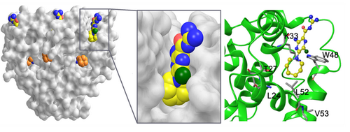 在欧阳波研究员和周界文研究员的指导下,博士研究生赵琳琳成功纯化出状态均一、有生物活性的p7蛋白。运用甲基谱滴定的方法,比较在金刚烷乙胺、HMA滴定下蛋白质谱图的不同,发现在蛋白结构变化剧烈的顶端化学位移变化相似,但是在中间25位缬氨酸,与金刚烷乙胺不同,HMA滴定并没有明显变化。接下来,研究人员通过核极化效应方法测定了HMA在p7内的结合位点,发现与金刚烷乙胺不同,HMA结合于p7靠底部疏水区。研究人员随后与天津医科大学的王树青博士合作,通过分子动力学模拟手段,进一步精确地定位了该结合位点。研究结果表明,虽然HMA与金刚烷乙胺的结合位点不一样,但它们引起的p7构象变化类似,表明其抑制机理相似,结合位点均与疏水性相关,这将为研发以p7为靶点的新型药物分子起到一定的指导借鉴作用。