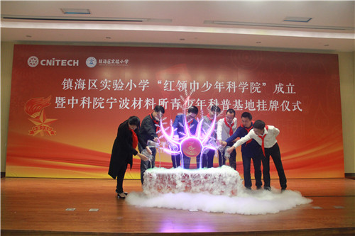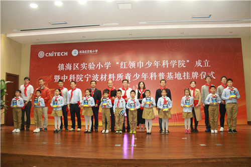 5月16日,中国科学院宁波材料技术与工程研究所与镇海区实验小学联合举行宁波材料所青少年科普实践基地挂牌暨镇海区实验小学“红领巾少年科学院”成立仪式。宁波市科协巡视员、党组成员陈宗志,共青团镇海区委书记计允斌,镇海区教育局党委委员、副局长徐振捷,镇海区科技局党组成员、区科协副主席郑铭里,镇海区教育局团工委副书记、少先队总辅导员赵多佳,镇海区实验小学校长韩亚斌,宁波材料所所属新能源所所长陈亮等出席仪式,中科院宁波材料所导师代表及镇海区实验小学首批“红领巾科学院小院士”参加仪式。