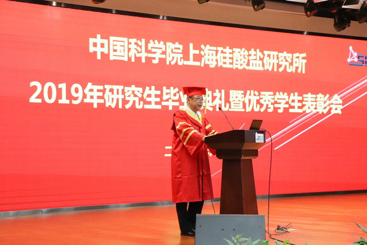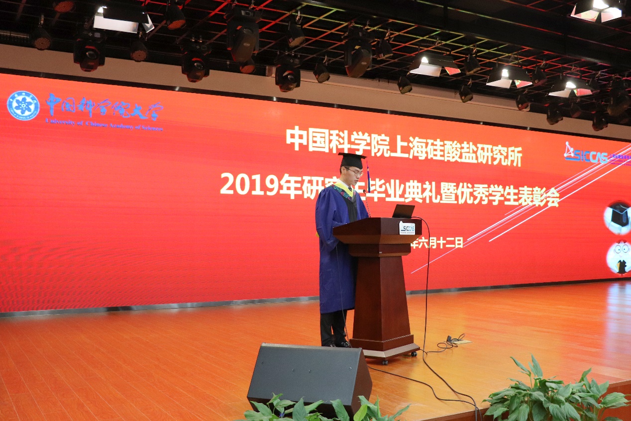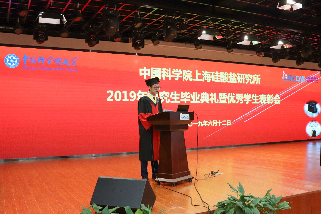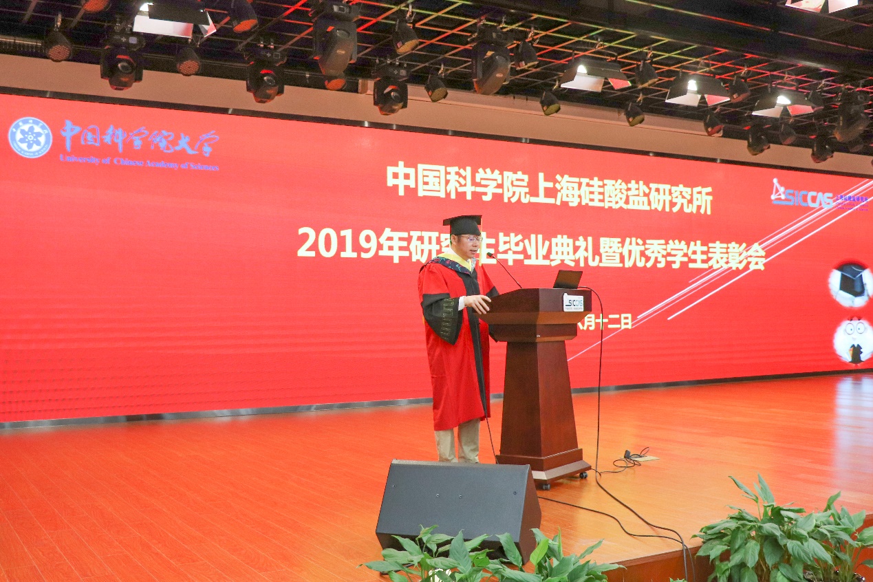 6月12日上午,中国科学院上海硅酸盐研究所2019年研究生毕业典礼暨优秀学生表彰会在嘉定园区G楼3楼报告厅召开。上海硅酸盐所所长宋力昕,学位委员会副主席、党委副书记、纪委书记杨建华,副所长吴成铁,所长助理孙静,研究生部主任周智为、副主任陆彩飞,毕业生导师代表等出席典礼。典礼由陆彩飞主持。