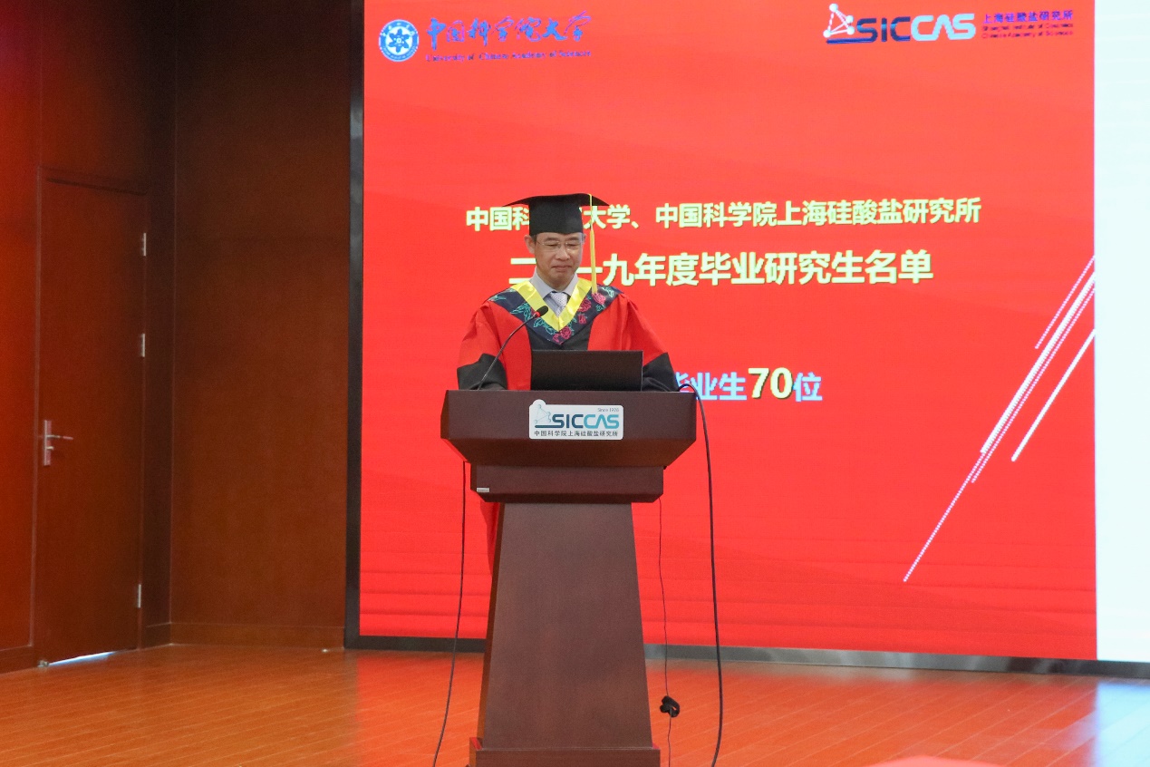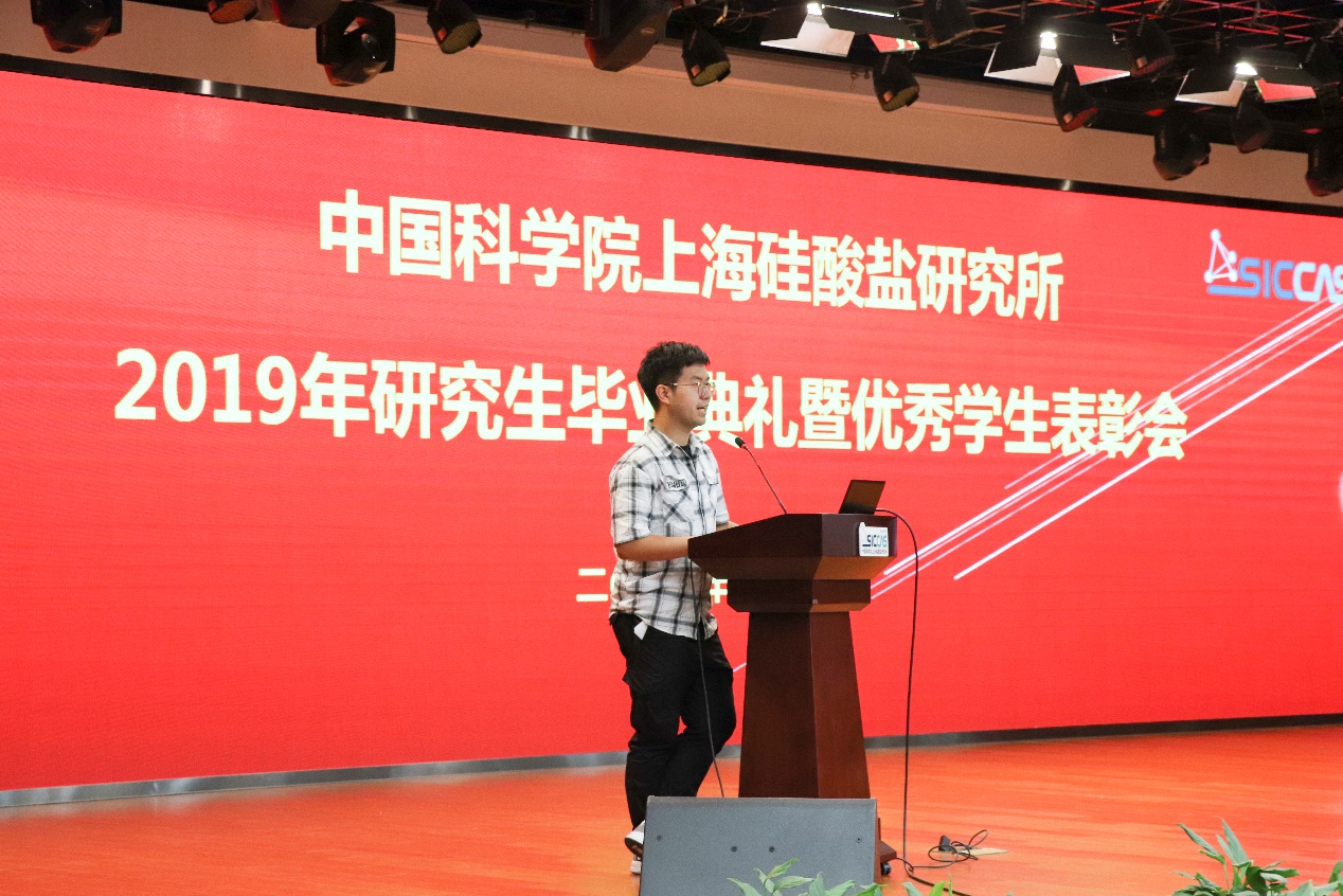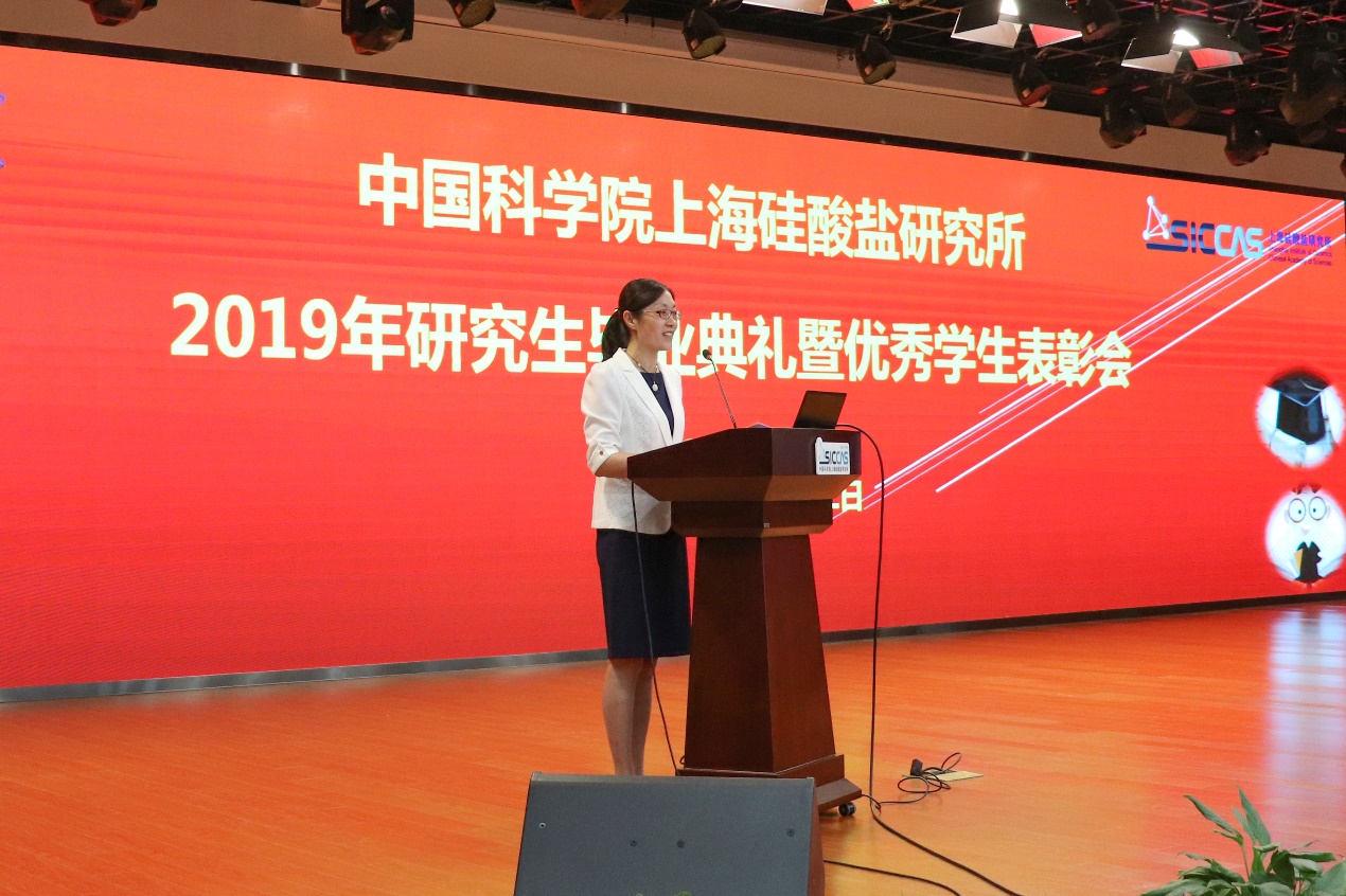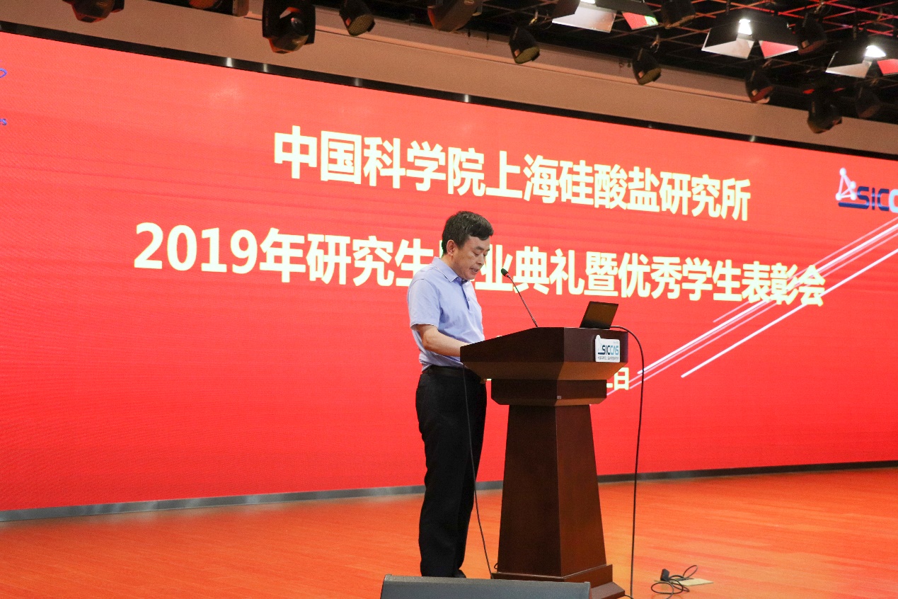 6月12日上午,中国科学院上海硅酸盐研究所2019年研究生毕业典礼暨优秀学生表彰会在嘉定园区G楼3楼报告厅召开。上海硅酸盐所所长宋力昕,学位委员会副主席、党委副书记、纪委书记杨建华,副所长吴成铁,所长助理孙静,研究生部主任周智为、副主任陆彩飞,毕业生导师代表等出席典礼。典礼由陆彩飞主持。