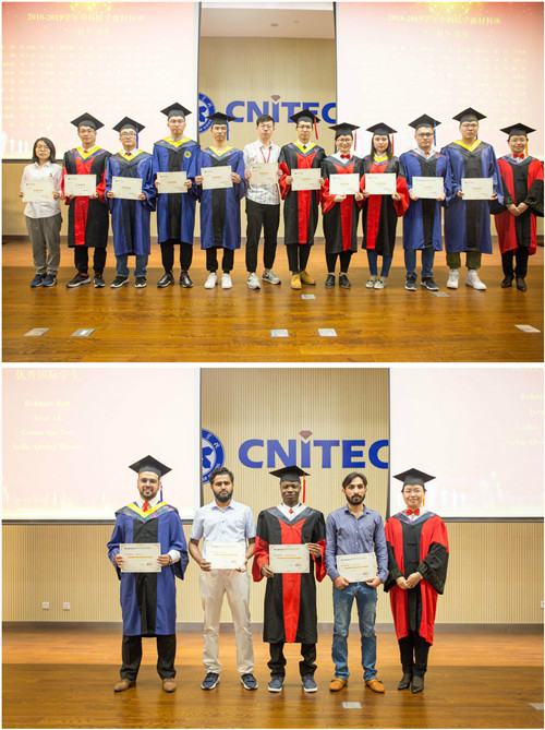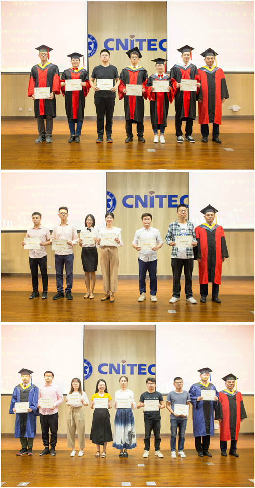 毕业典礼期间,还举行了2018-2019学年优秀学生颁奖仪式。张瑞丽宣读了相关表彰决定,宁波长阳科技有限公司技术总监周玉波博士、激智科技股份有限公司副总裁李刚博士和宁波材料所党委副书记、纪委书记李勇研究员分别为2019年度长阳奖学金获得者、2019年度激智创新奖学金获得者和2019年度龙芯奖学金获得者颁奖;宁波材料所副所长杨甦为2019届优秀毕业生、2019年度中国科学院大学三好标兵和2019年度优秀学生干部颁奖;宁波材料所副所长张瑞丽为2019年度三好学生代表和2019年度优秀国际学生颁奖。