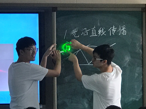 上海光机所研究生会科普与外联部王港伟、刘腾为30名同学带来了题为《会反弹的光》的第一节课程。王港伟深入浅出地向同学们讲述了光的直线传播、反射和折射原理,并通过激光笔等道具,演示了“会反弹的光”。课堂上,还在保证安全地前提下,开展了实验互动。在一个小时的课程中,同学们表现出了极大的热情,课堂气氛十分活跃。