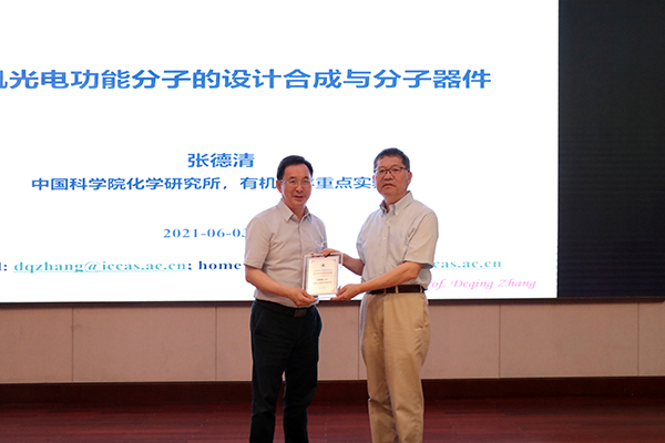 马大为研究员向张德清研究员颁发有机所交叉学科讲座纪念牌