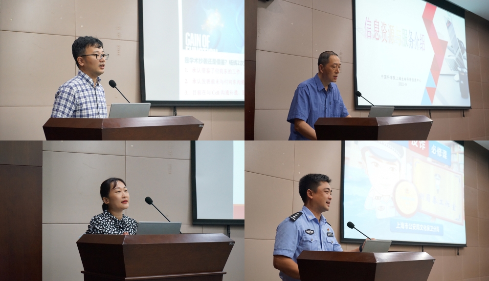 全体新生合影留念后,郭金华为同学们详细介绍了中心的定位与布局、发展历史和现状,深刻阐述了老一辈科学家精神,并期待与同学们共同书写美好的未来。接着,凌祺桦研究员就如何规范撰写实验记录给同学们进行了详细的介绍。孔朝晖给同学们作了题为“科学精神与科研诚信建设”的讲座,告诫同学们要恪守科研道德,践行科研诚信。中科院上海生命科学信息中心江晓波老师向同学们介绍了生命科学图书馆的馆藏资源和各类服务。医务室张医生详细介绍了就医流程、医保信息和相关规则。上海市公安局文化保卫分局的谢警官对冒充公检法、杀猪盘、网购刷单等多种诈骗手法分别作了详细介绍,向同学们提供了专业的辨别和应对技巧,提醒同学们要时刻提高警惕,注意防范。综合管理处的李坤武和周海龙就如何做好实验室安全和日常安全分别对同学们进行了教育培训。