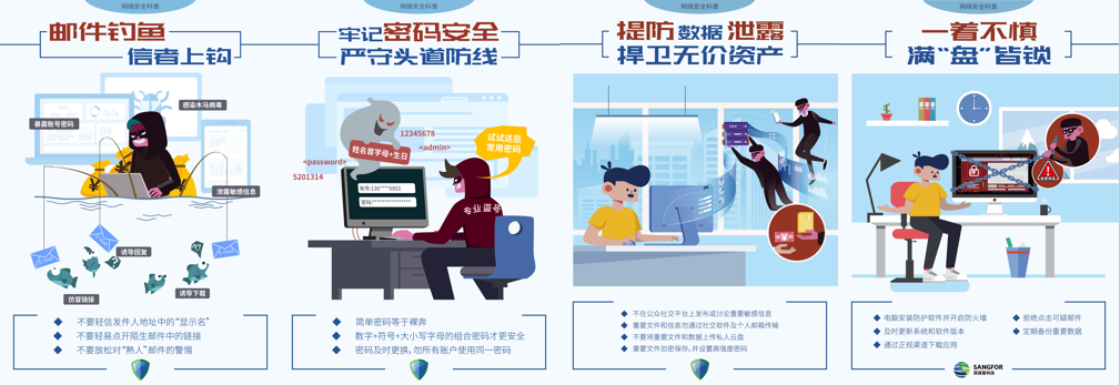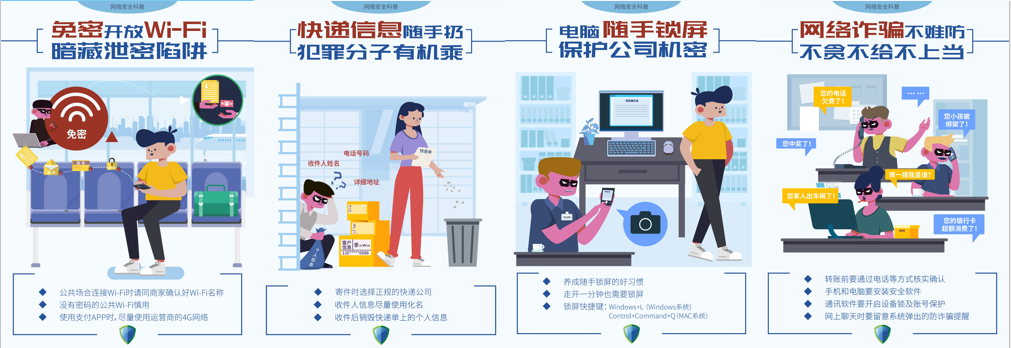 上海天文台始终重视网络信息安全工作,信息计算中心每年面向全台网络用户开展网信宣传教育和培训活动。为贯彻落实国家网信工作精神,2021年活动周期间,信息计算中心以海报张贴、视频展播等形式进行网络信息安全科普宣传,内容覆盖免密开放Wi-Fi泄密陷阱、网银手机支付盗刷、移动充电站安全、监控摄像头安全、网络诈骗、钓鱼邮件、密码安全、勒索病毒等在日常工作和生活中容易造成信息泄露、遭受网络攻击的各种情况。
