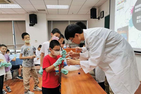 接着进行的是“蓝瓶子”实验。亚甲基蓝的碱性溶液和葡萄糖发生作用后蓝色消失,在小朋友们摇晃无色溶液后蓝色又渐渐出现。神奇的现象让小朋友们十分兴奋,小朋友们还激动地拿着正在变色的试管,跑去和在后排听课的家长分享这有趣现象。
