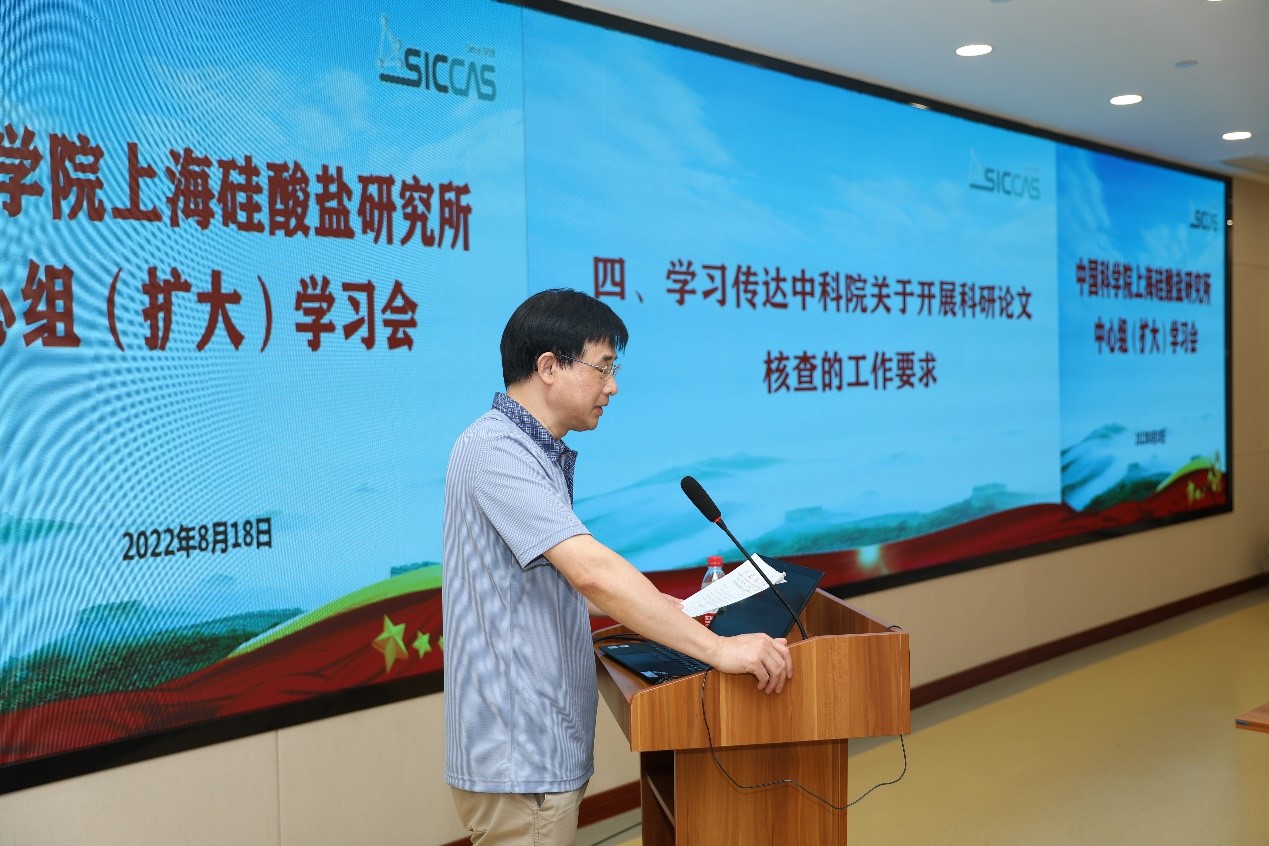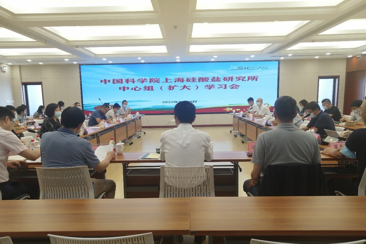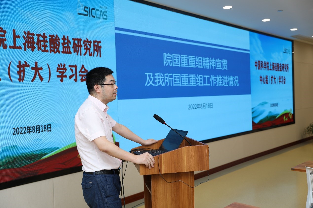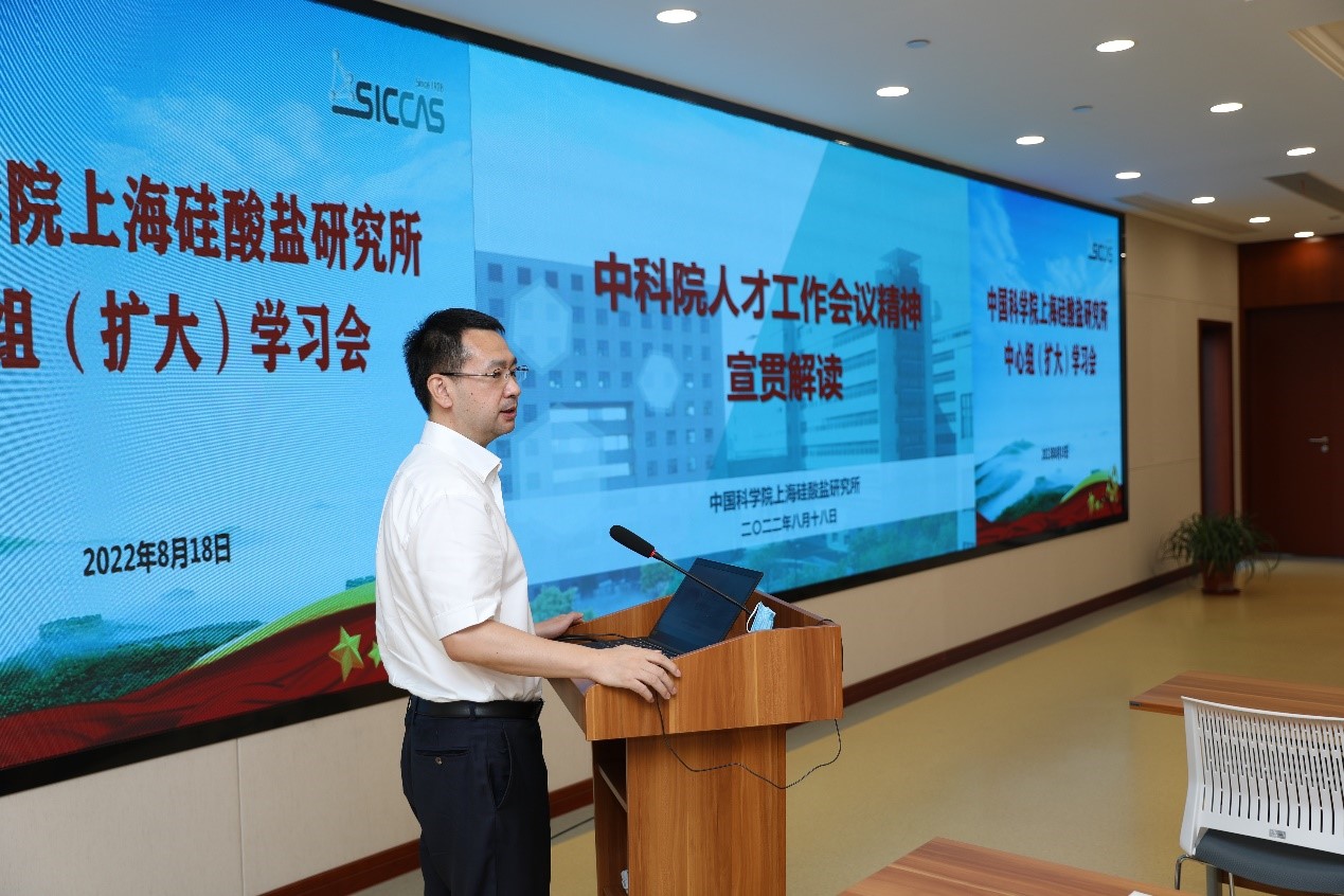 8月18日下午,中国科学院上海硅酸盐研究所组织召开中心组(扩大)学习会,学习贯彻落实中科院全国重点实验室体系重组工作宣贯推进会和2022年中科院人才工作会议精神。领导班子成员、两委委员、中层正职、党(总)支部书记、群团组织负责人等近50人参加学习会,会议由党委书记王东主持。