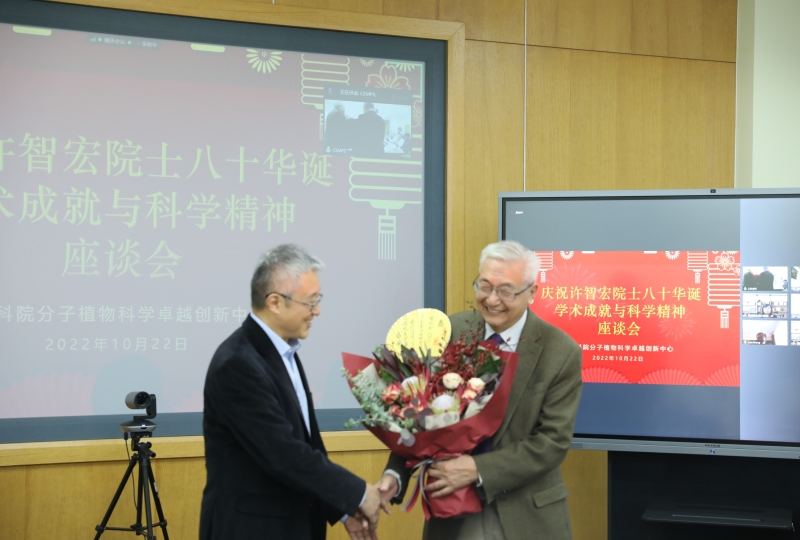 欣逢党的二十大胜利召开,为传承和弘扬科学家精神,中科院院士,中科院原副院长,北京大学前校长、植物生理学家许智宏院士八十华诞学术成就与科学精神座谈交流会于10月22日上午在中科院分子植物科学卓越创新中心成功举办。许智宏院士、李家洋院士、裴钢院士、种康院士、钱前院士、朱作言院士、康乐院士、万建民院士、韩斌院士、赵国屏院士、陈晓亚院士、林鸿宣院士,还有来自中科院院机关、兄弟院所和多所高校的领导专家,许智宏院士的同行同事和学生代表,以及分子植物卓越中心领导班子成员,植物分子遗传国家重点实验室研究组长和中心职能部门负责人等参加座谈会。